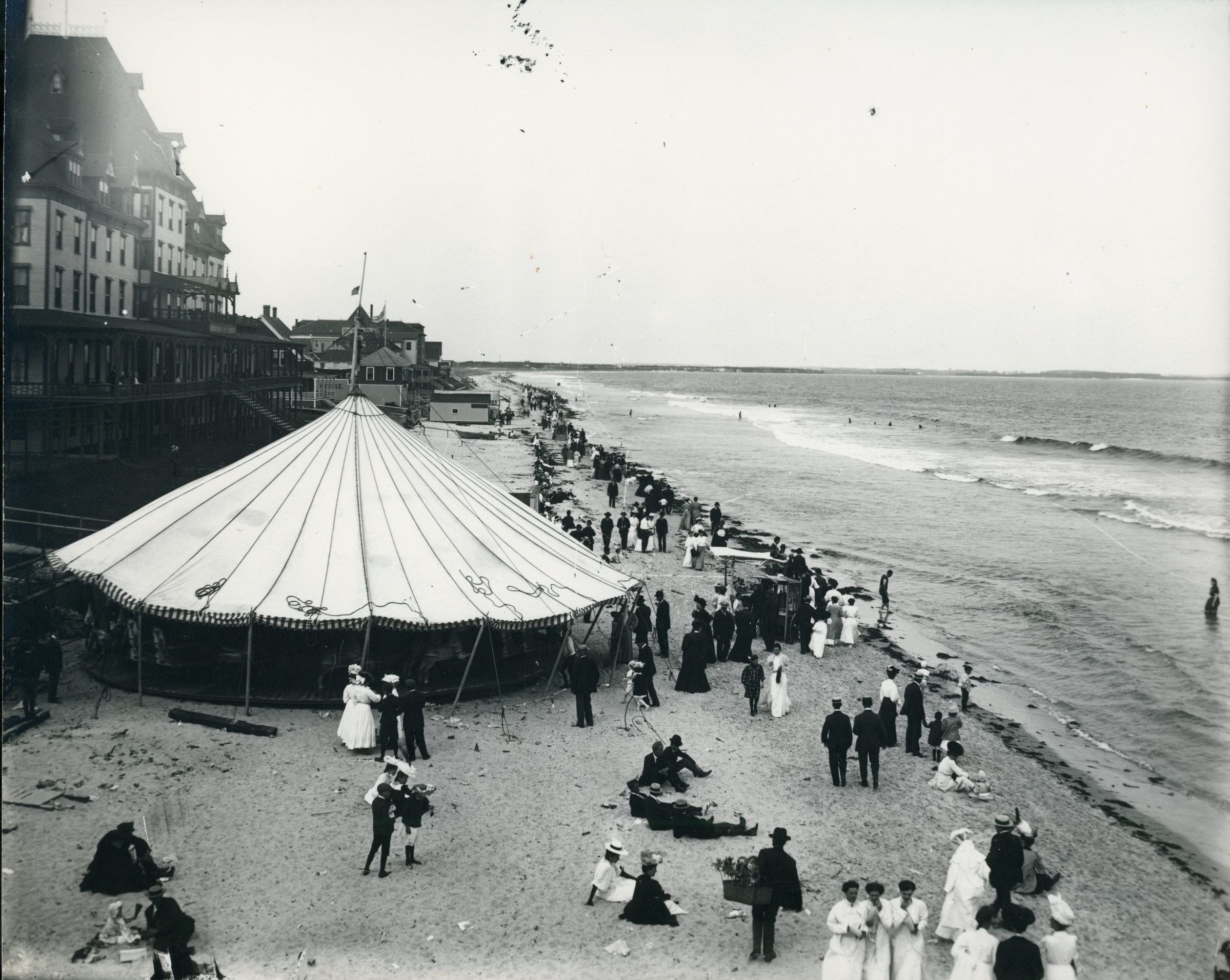 Print photograph (from a glass plate negative) of the north side of the Old Orchard Pier in Old Orchard Beach, taken from the entrance of the Pier. The carousel that fronted Hotel Fiske can be seen.