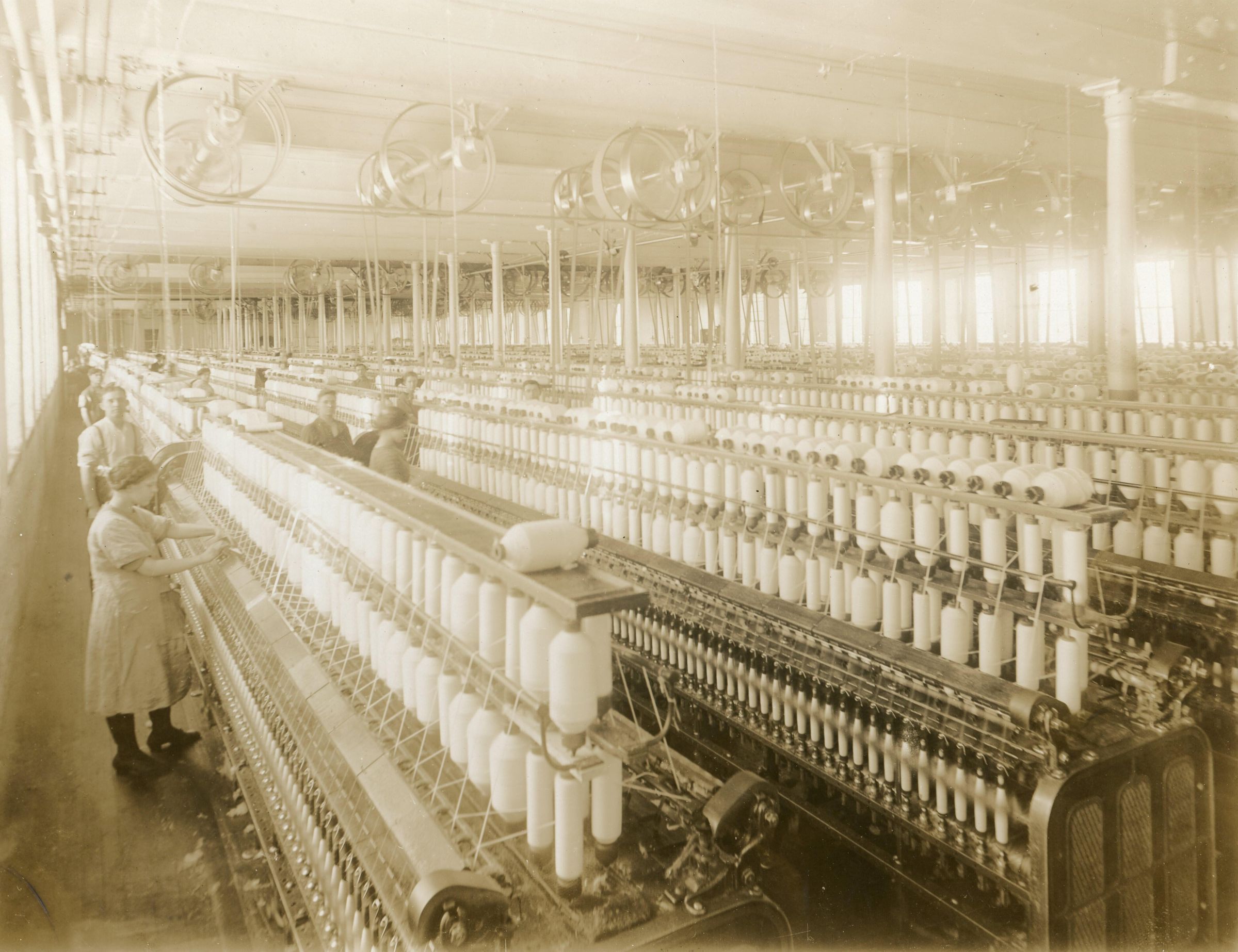 Photograph of workers at roving frames in the Laconia Division of the Pepperell Manufacturing Company.