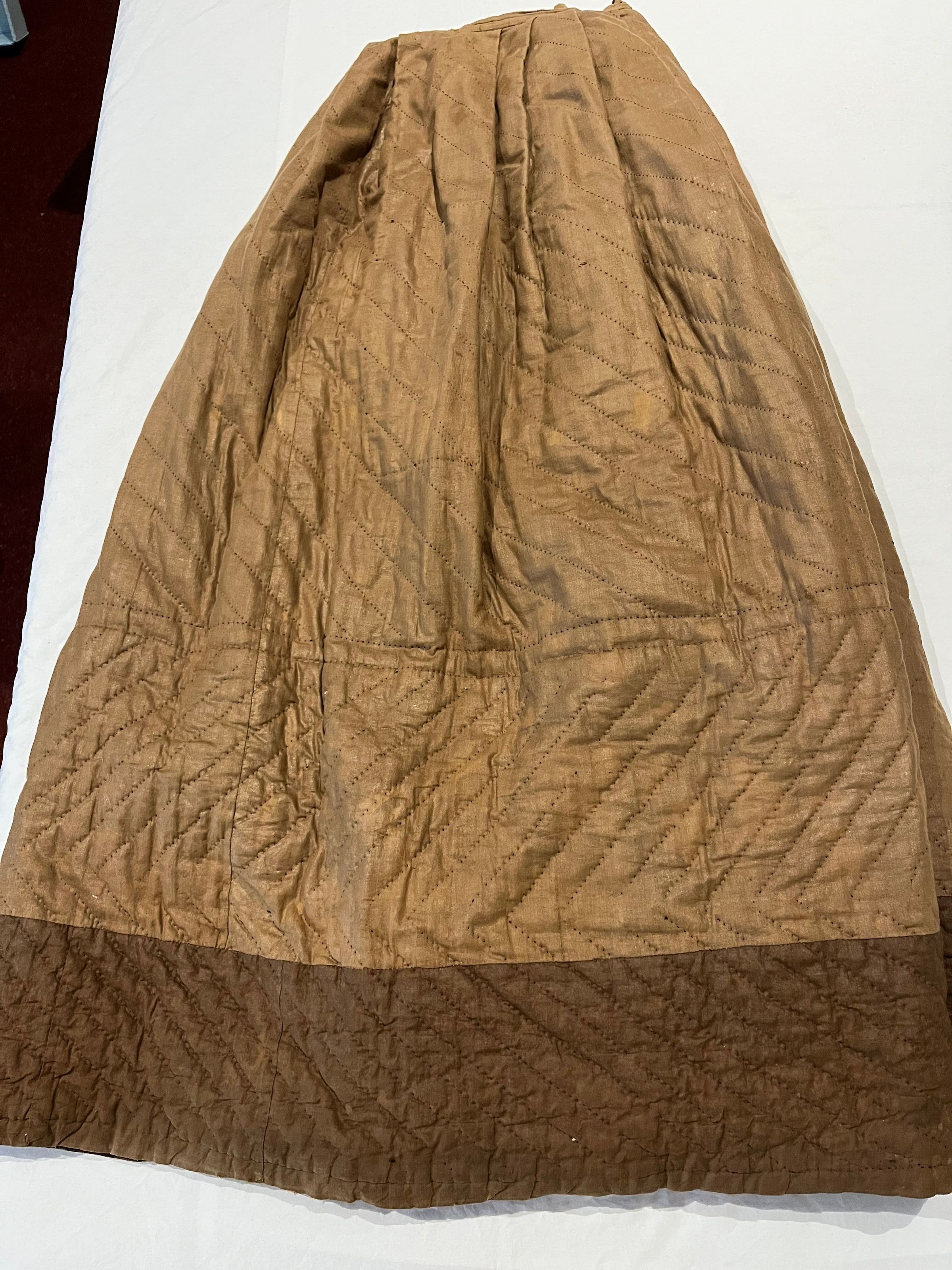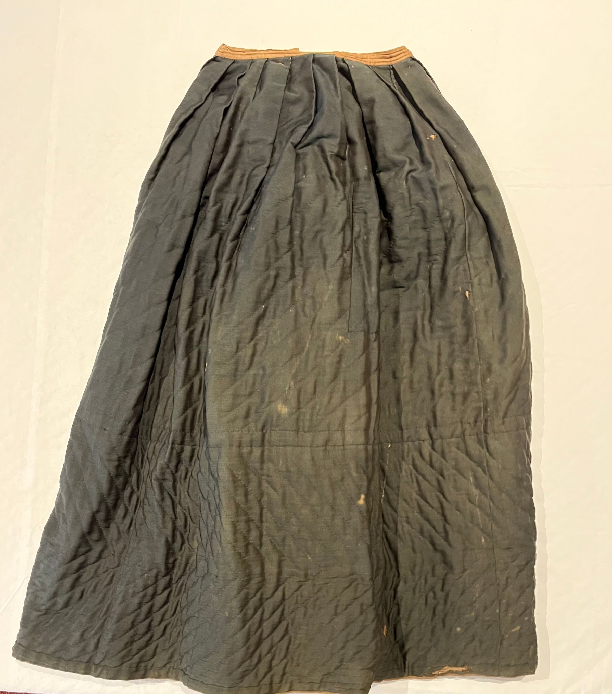 Quilted black wool petticoat lined with two colors of brown glazed cotton. Wool batting in the lower section only. Three different sections of quilting pattern. Diagonal in one direction only in the upper section. Below that are two parallel horizontal bands of quilting. The bottom 16" is divided in half, with diagonal channels channels going in one direction for 8" and then 8" in the other. Pleated at the waist to a narrow length (1 1/4") of the lining fabric. Single button closure at the back.
