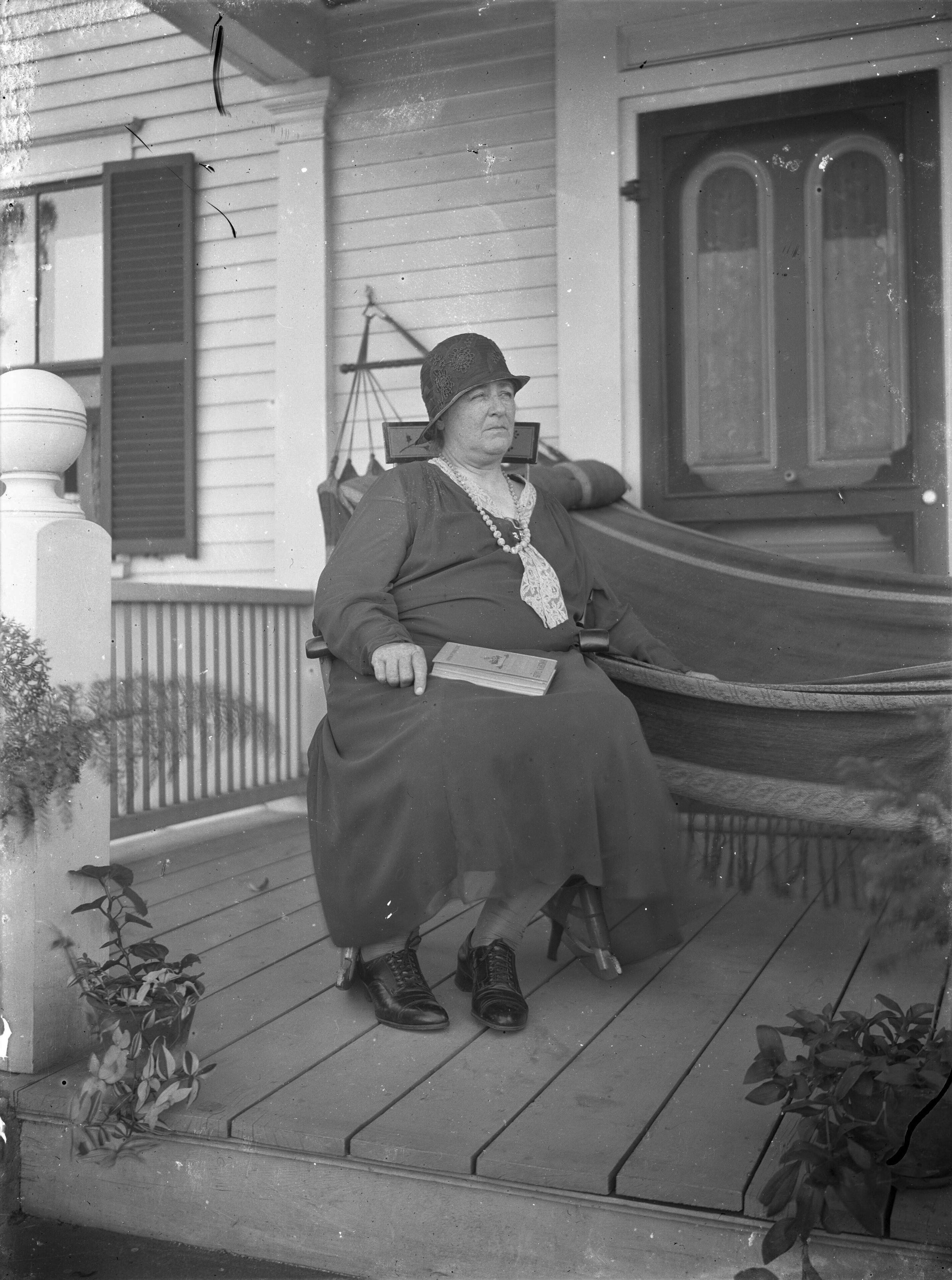 Glass plate negative photo of an unidentified woman sitting at a porch.