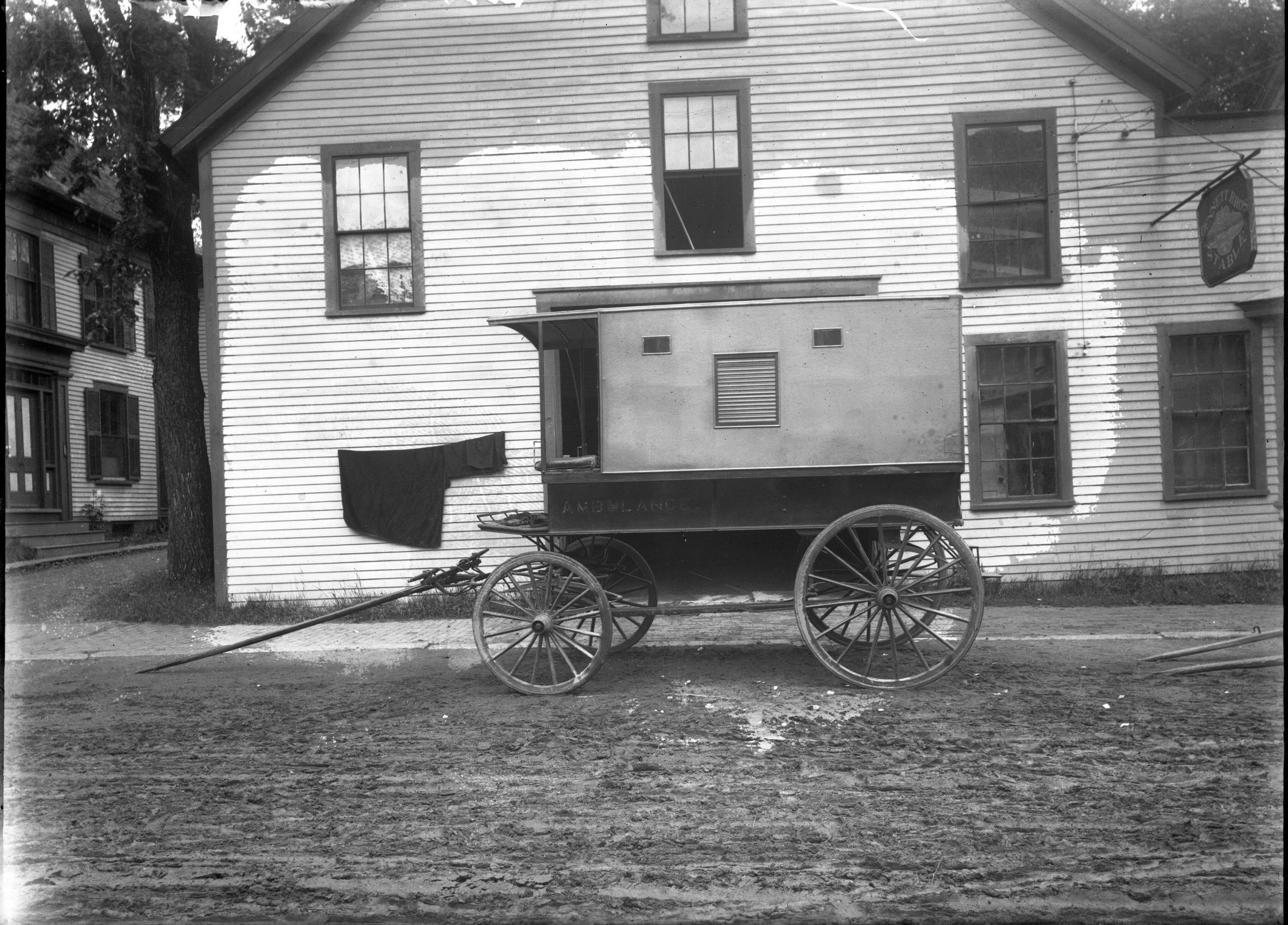 Glass plate negative photo of an ambulance wagon at the Dennett Bros Stable on Thornton Avenue in Saco.