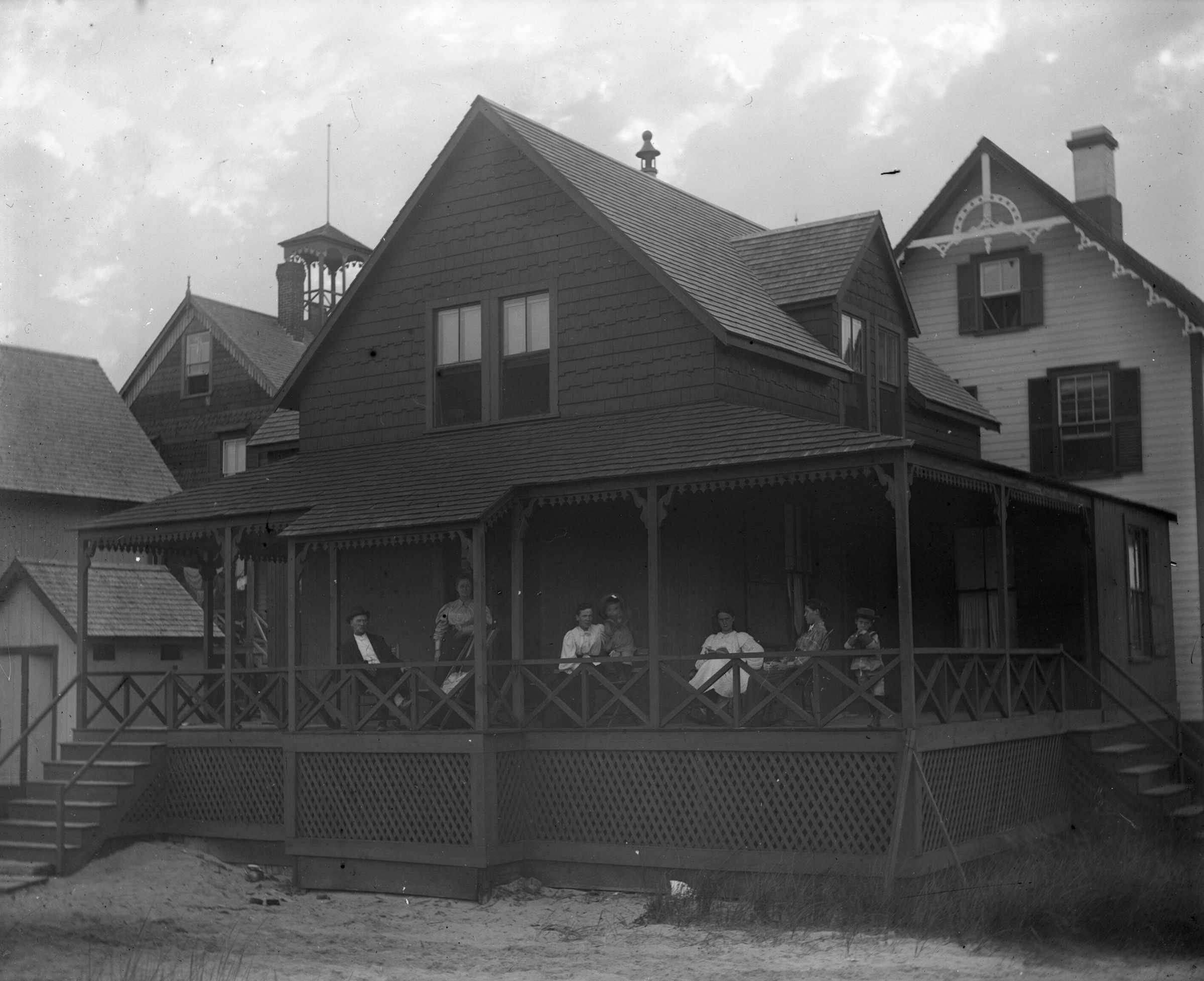 A glass plate negative photo of a house with several people on the front porch. "Ricker Mansion, Ocean Park, ME" is written on the plate sleeve.Made/Created
