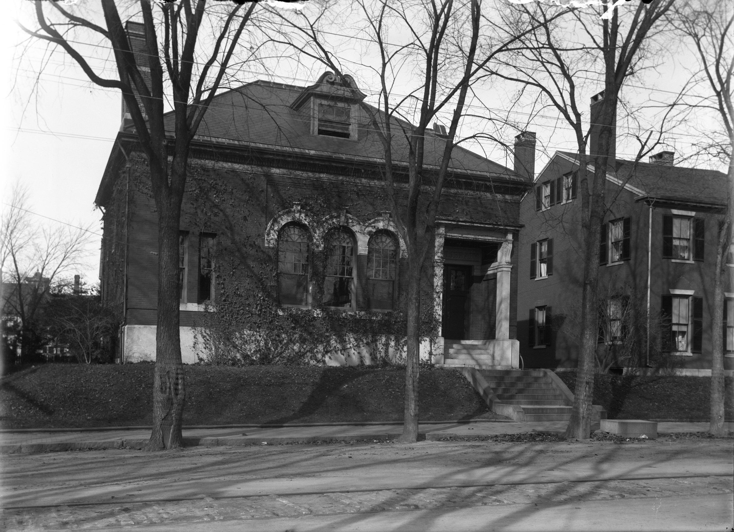 Glass plate negative photo of the old Dyer Library on Main Street, Saco, ME.