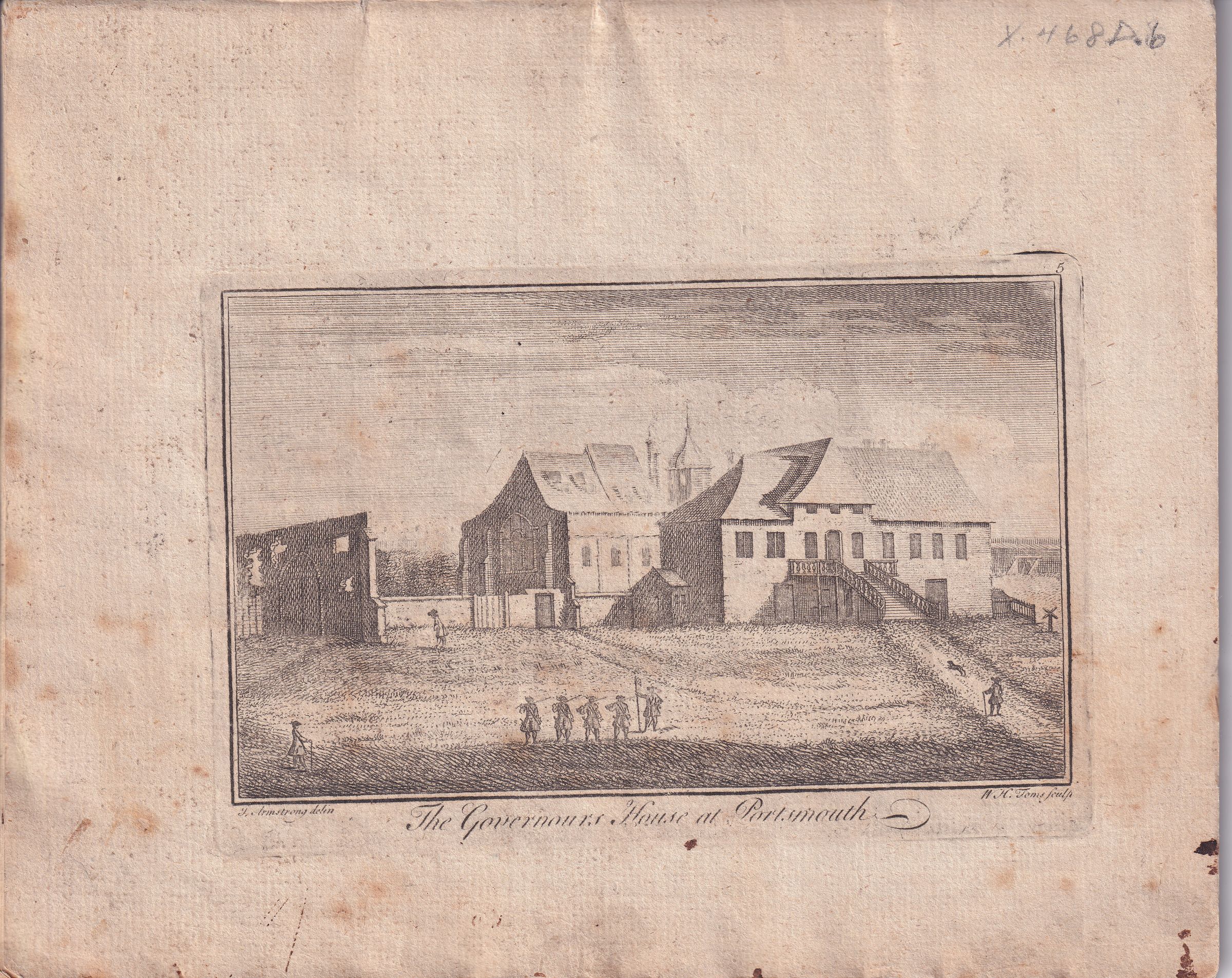 Blank notebook used for penmanship exercises by Eunice Cutts when she attended Eleanor Druitt's academy in Boston. The front cover has an engraving of a group of buildings with a large one in the foreground identified as "The Governours House at Portsmouth." On some of the pages, all of those on the left hand leaves, are repetitions of a single phrase copied in rows down the page. On the opposing pages, copied in a smaller hand, are various verses (often religious in nature) or poems, some of which run to several pages.Dimensions
