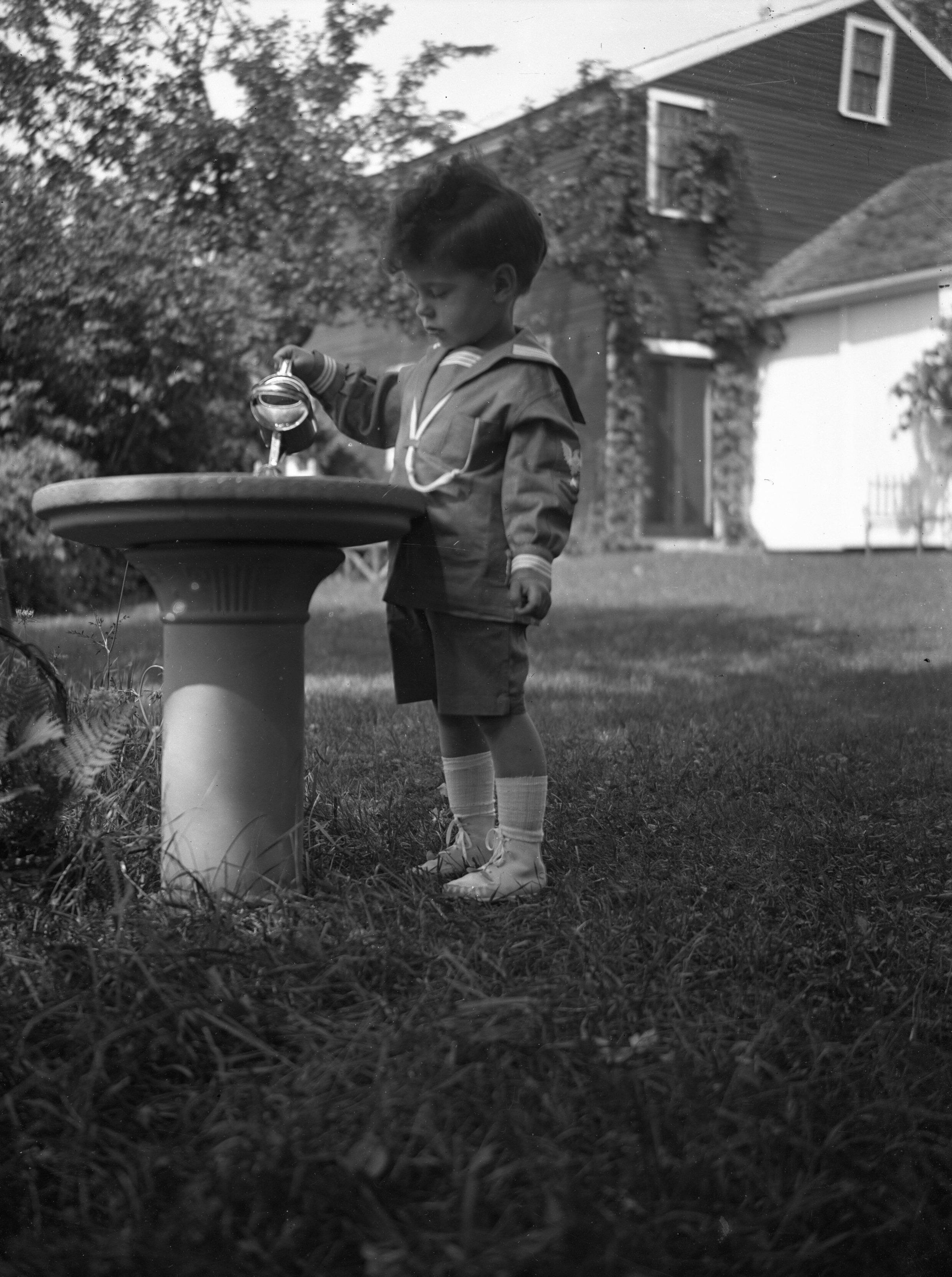 Glass plate negative photo of an unidentified boy playing at the fountain. (The same boy appears in 1993.21.380, .391, .392, .393, and .420)Made/Created