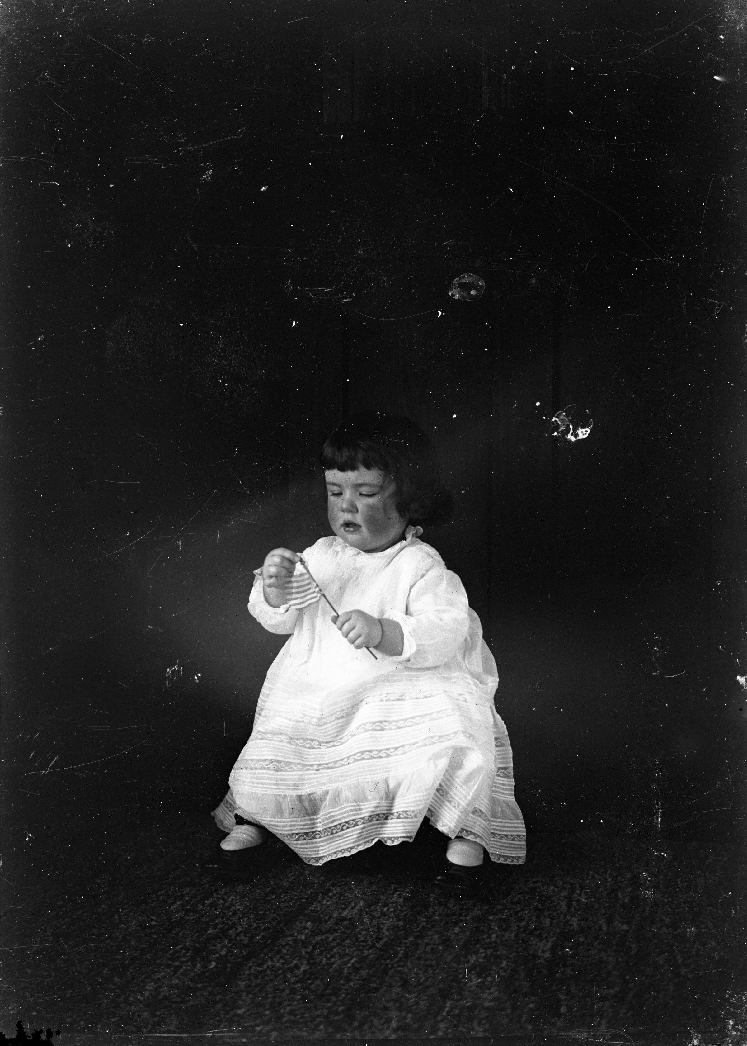 Glass plate negative photo of Phebe Bradbury playing with a small flag.