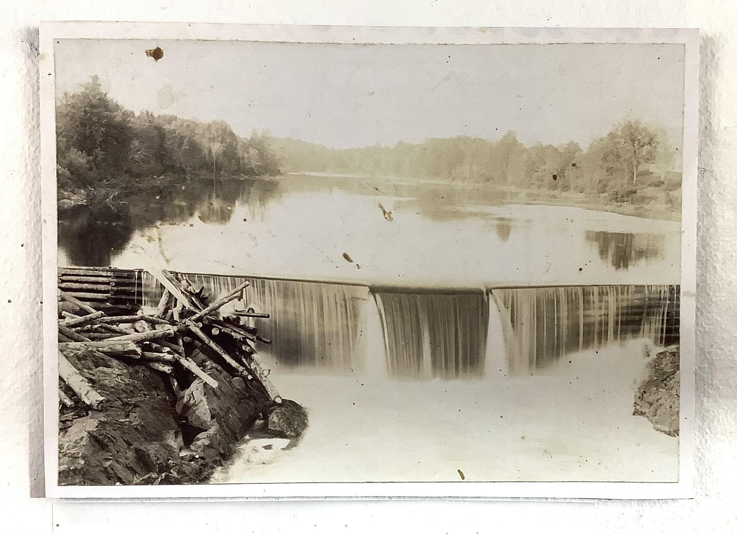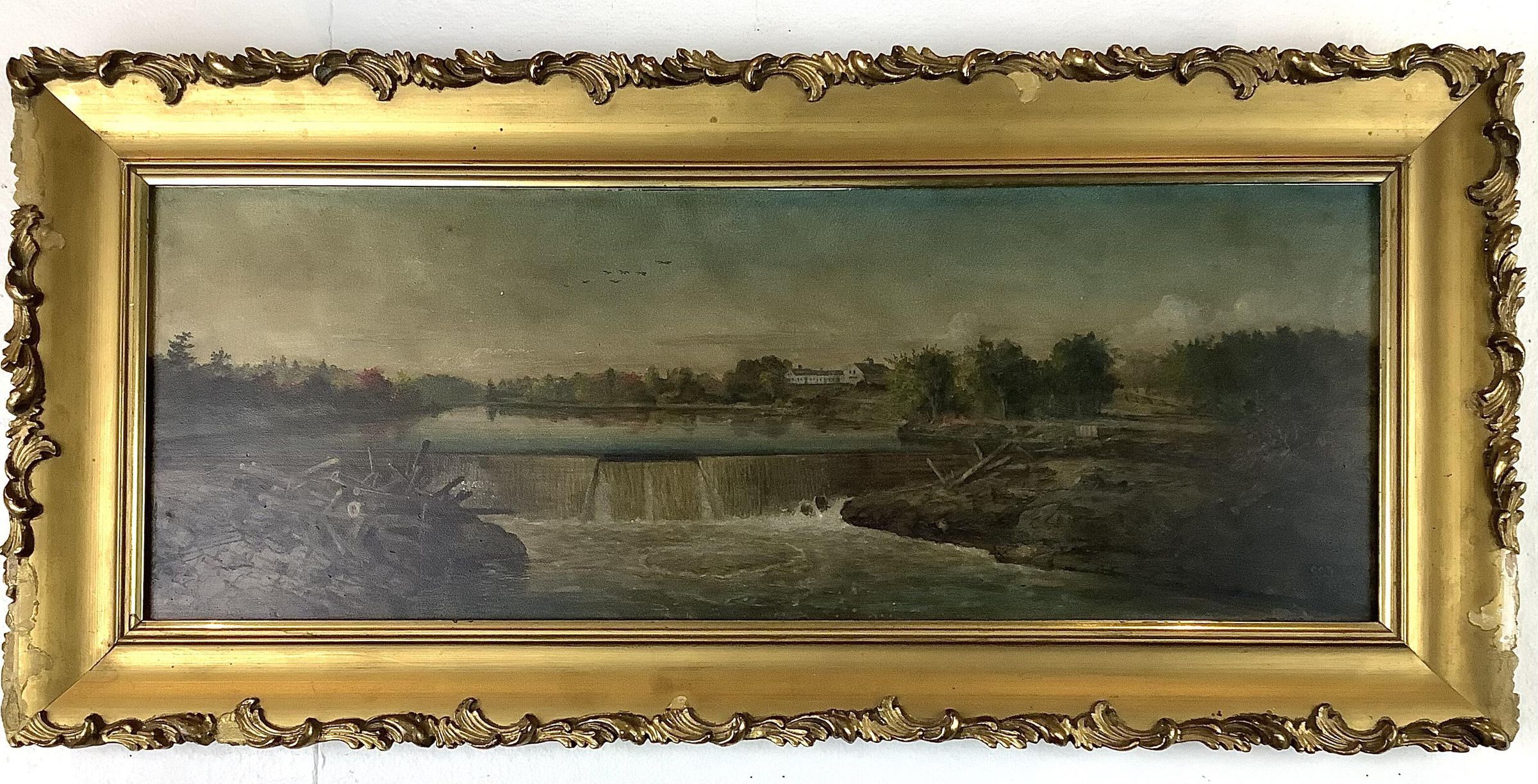 Oil on canvas painting of the falls on the Saco River. Piles of logs lay on the banks of the river. A white house and barn are visible in the distance. Gold frame with applied foliate ornament along the outer edges.Made/Created