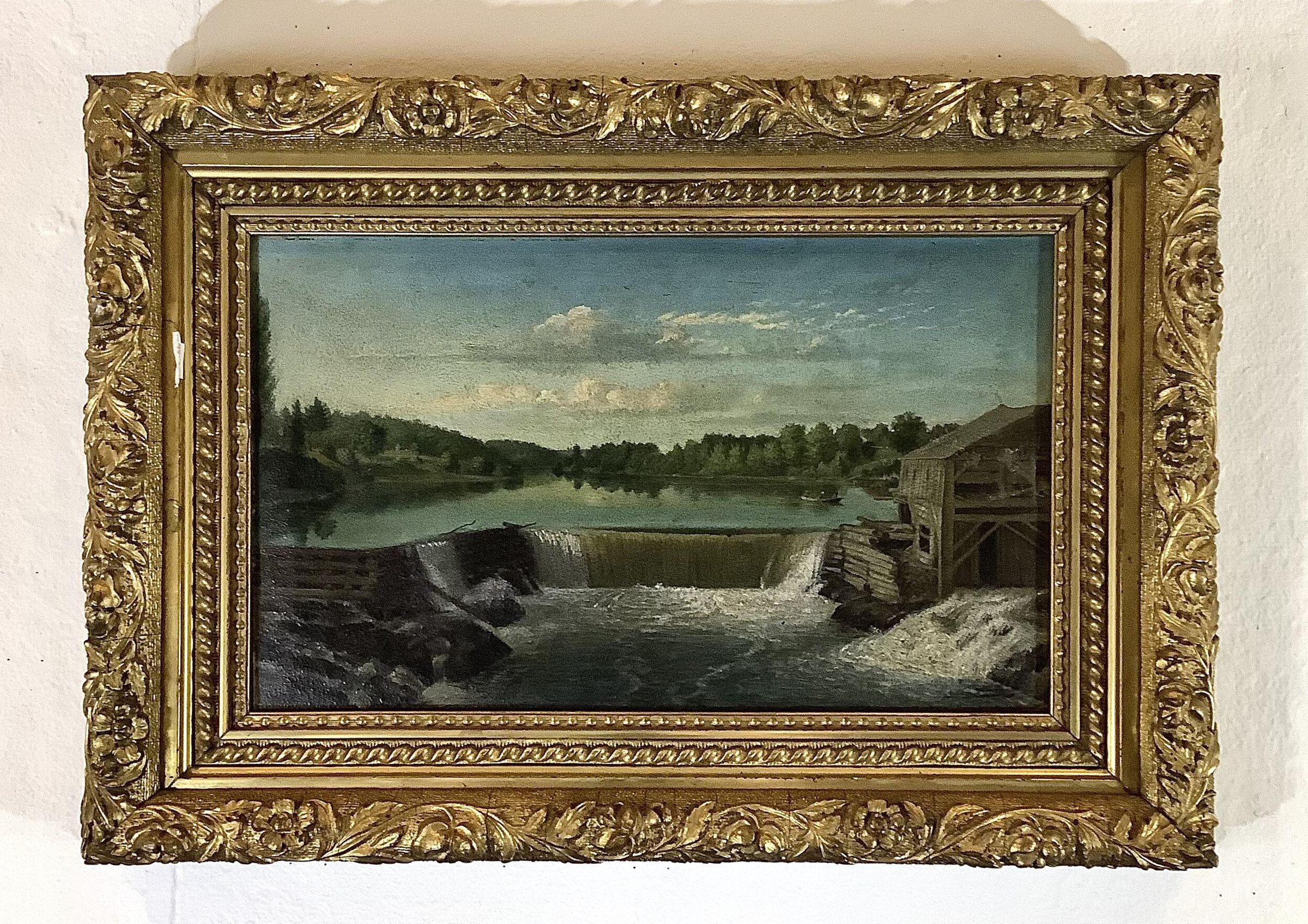 Oil on board painting of the falls on the Saco River. The water cascades over what appears to be a crib-style log dam. A wooden building sits at the right edge of the dam along the bank of the river. A small group of boaters are visible on the water just beyond the building. A few puffy clouds scud across the sky. In a gilt frame with molded floral and foliate decoration.Made/Created