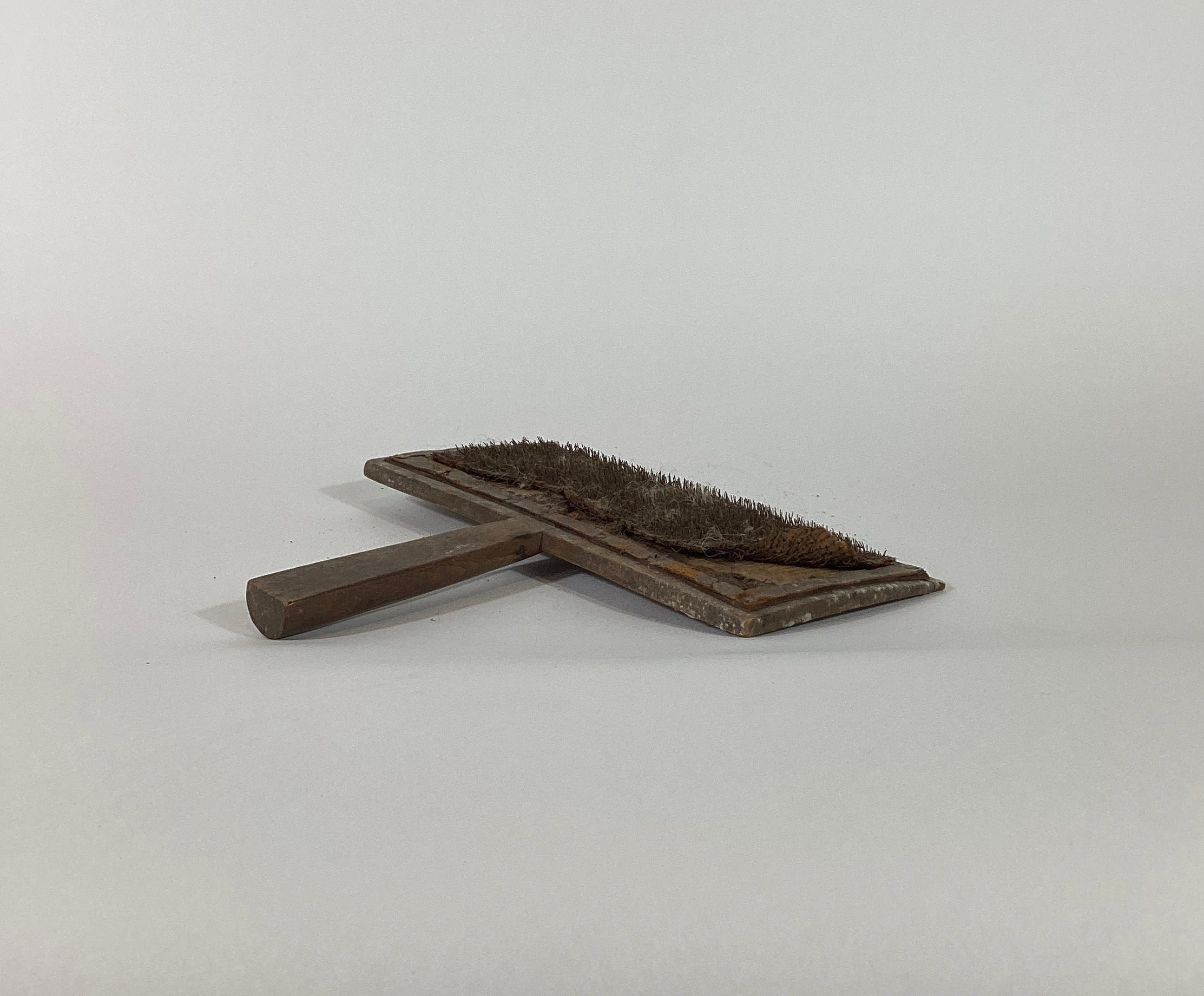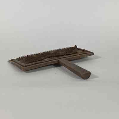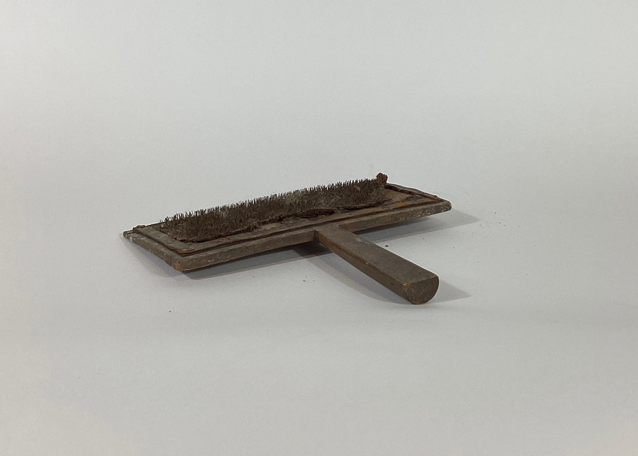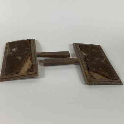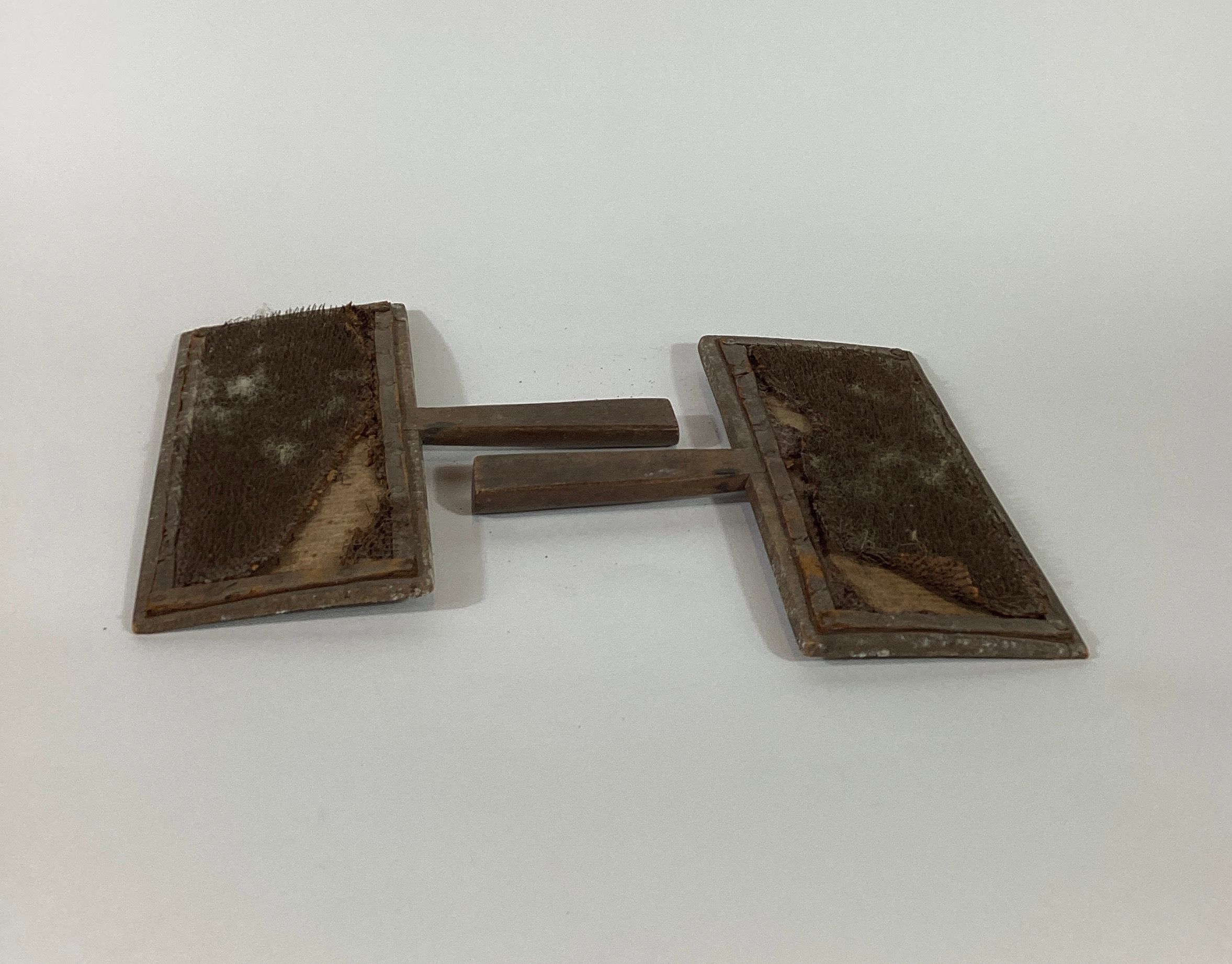 Wool or cotton fibers were placed between two hand cards such as these. The wire studded boards were stroked against each other to comb the fibers and join them in a continuous strand called a rolag. The fibers could then be spun from this form into yarn or thread.
