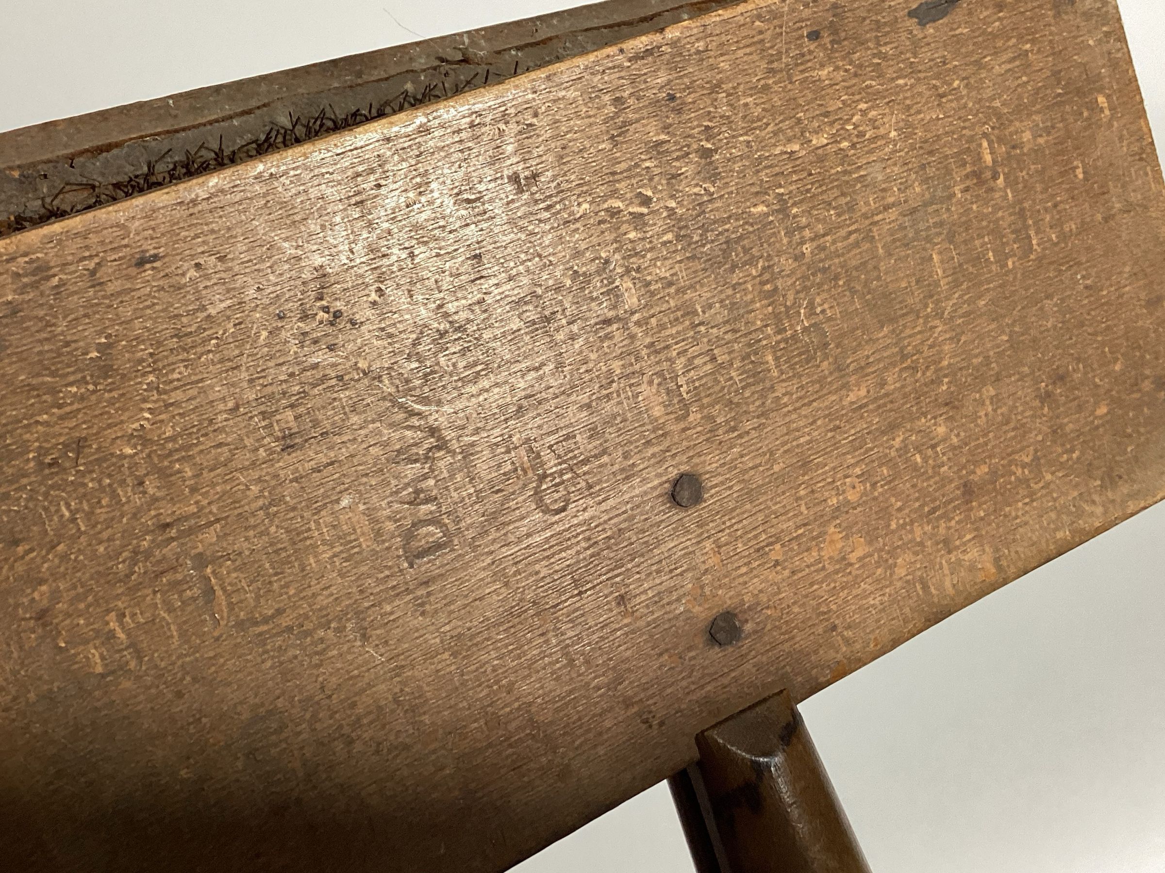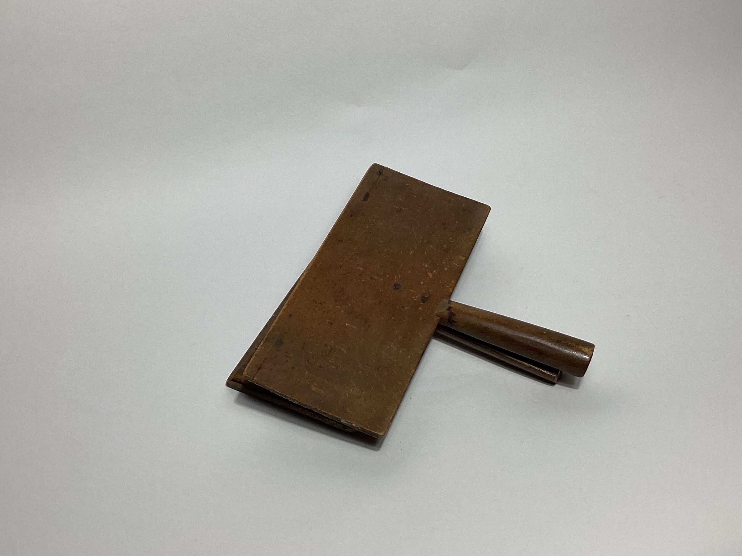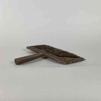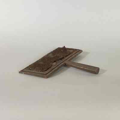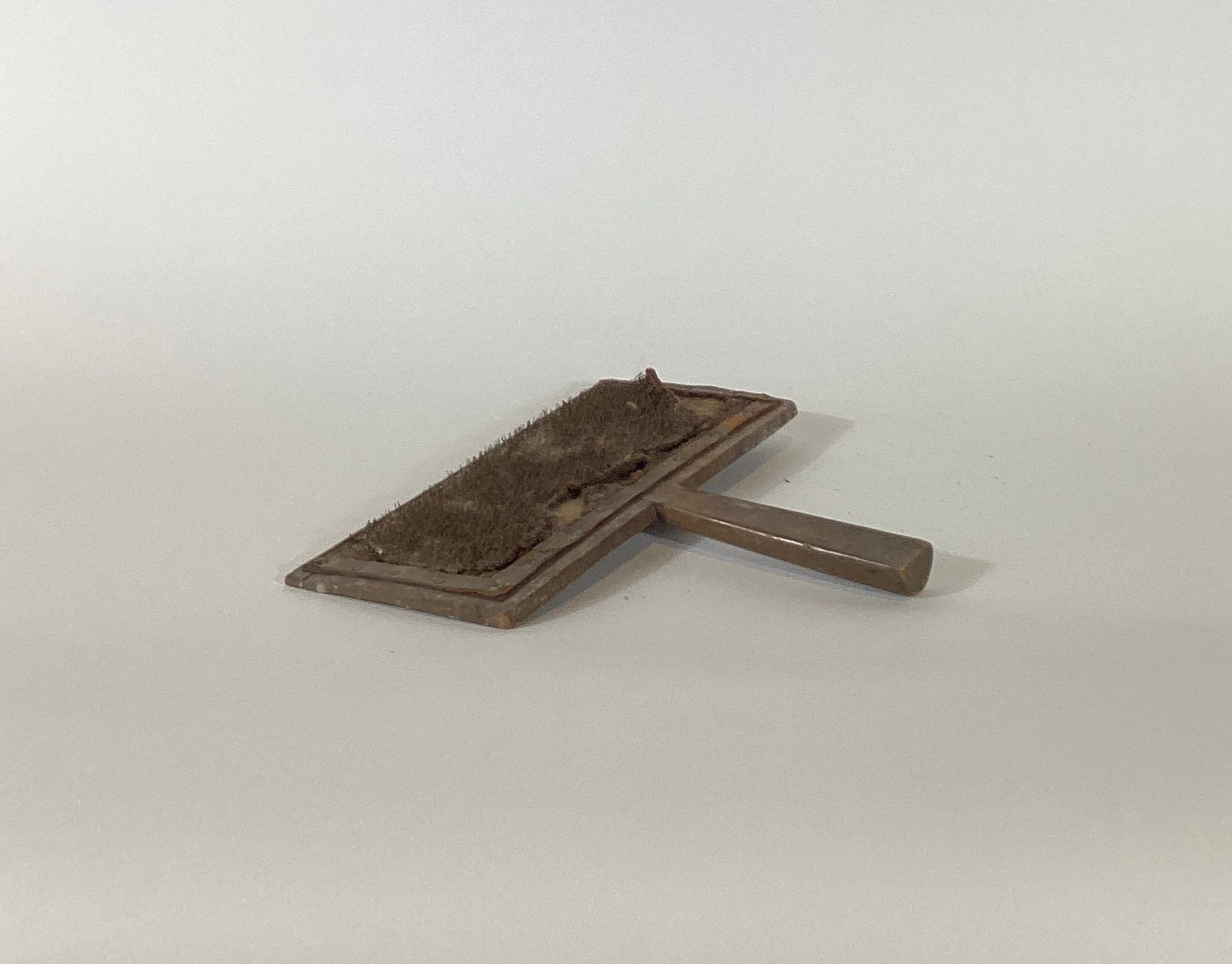 Wool or cotton fibers were placed between two hand cards such as these. The wire studded boards were stroked against each other to comb the fibers and join them in a continuous strand called a rolag. The fibers could then be spun from this form into yarn or thread.