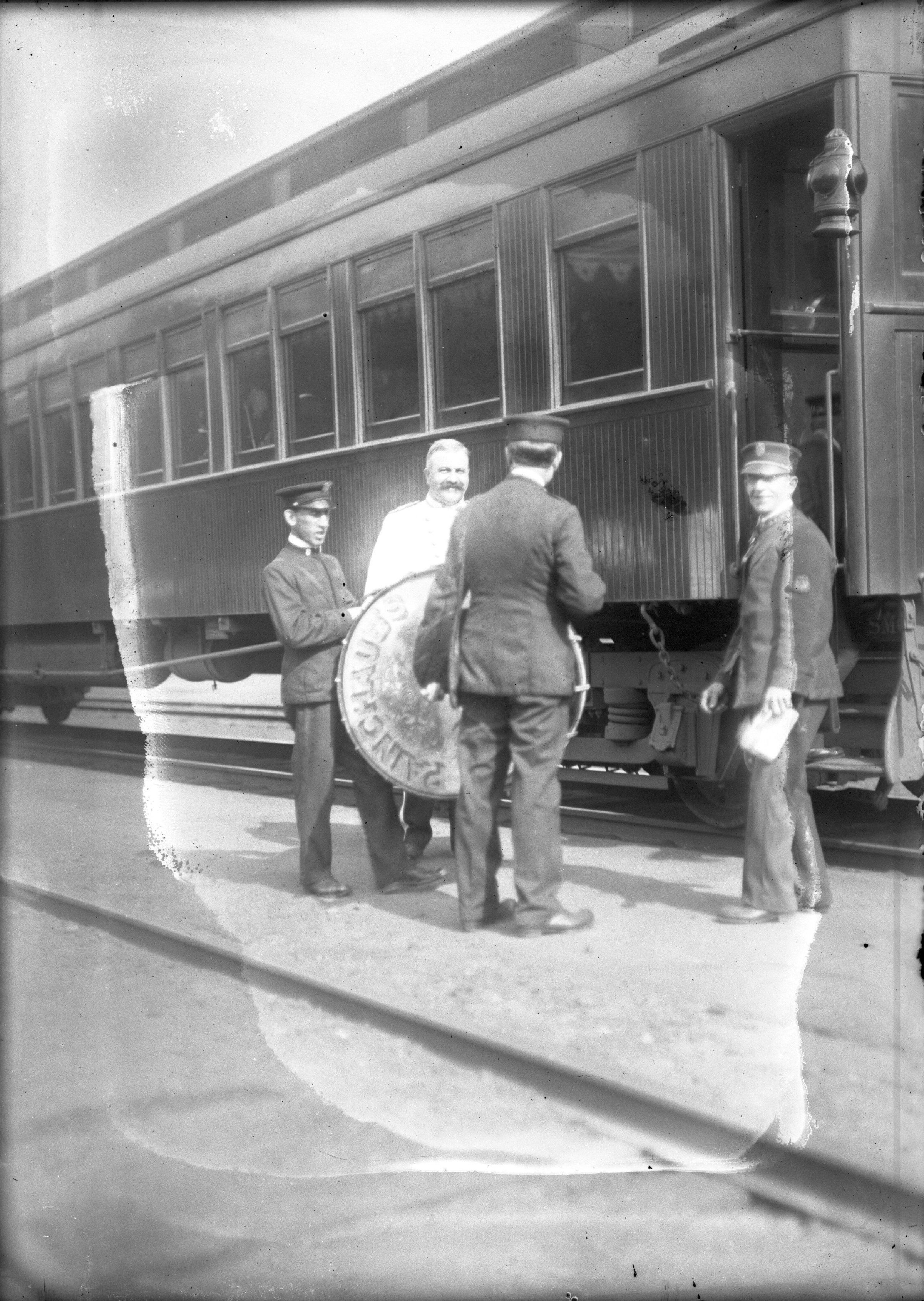 Glass plate negative photo of the Boston & Maine Railroad crew and Painchaud's Band drum major Joseph Harvey (1871/1872 - 1920) at Biddeford train depot. The Knight's Templar Commandery & Painchaud's Band took the train to Lowell, Massachusetts to participate in the St. John's Day Parade in 1913.
