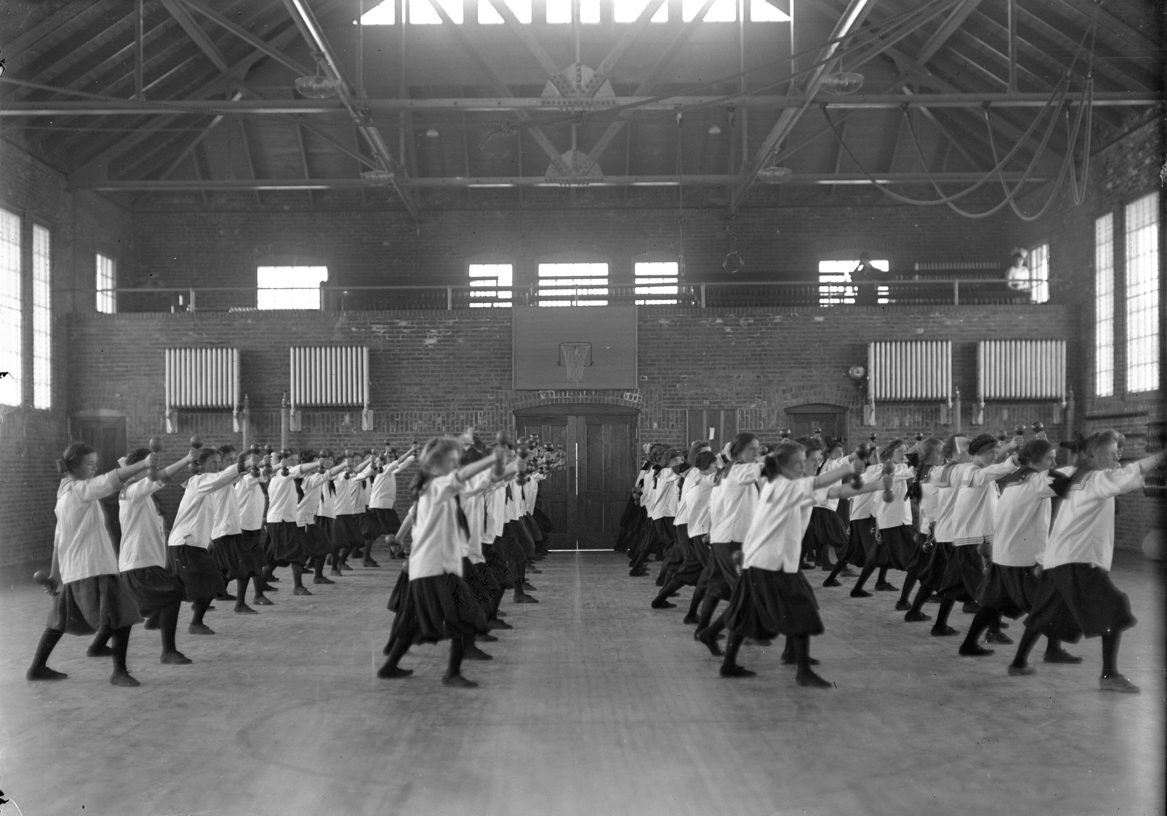 Glass plate negative photo of a group of girls training with weights at gym class at Thornton Academy. This is in the original George Addison Emery Gymnasium which was built in 1913. Today the building houses the school library.