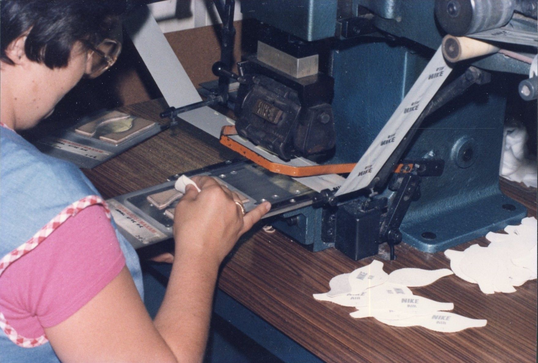 Color print photograph of Saco Nike Factory taken in July (or later), 1985. The Nike Factory located in Saco, Maine on Factory Island closed in November of 1985, about 8 years after it opened in 1978. The stated reason for closing was due to the increased labor cost and fringe benefits. After closing multiple American factories Nike focused on importing from Asia. 500 employees worked at the Saco Nike Factory, before shutting down.