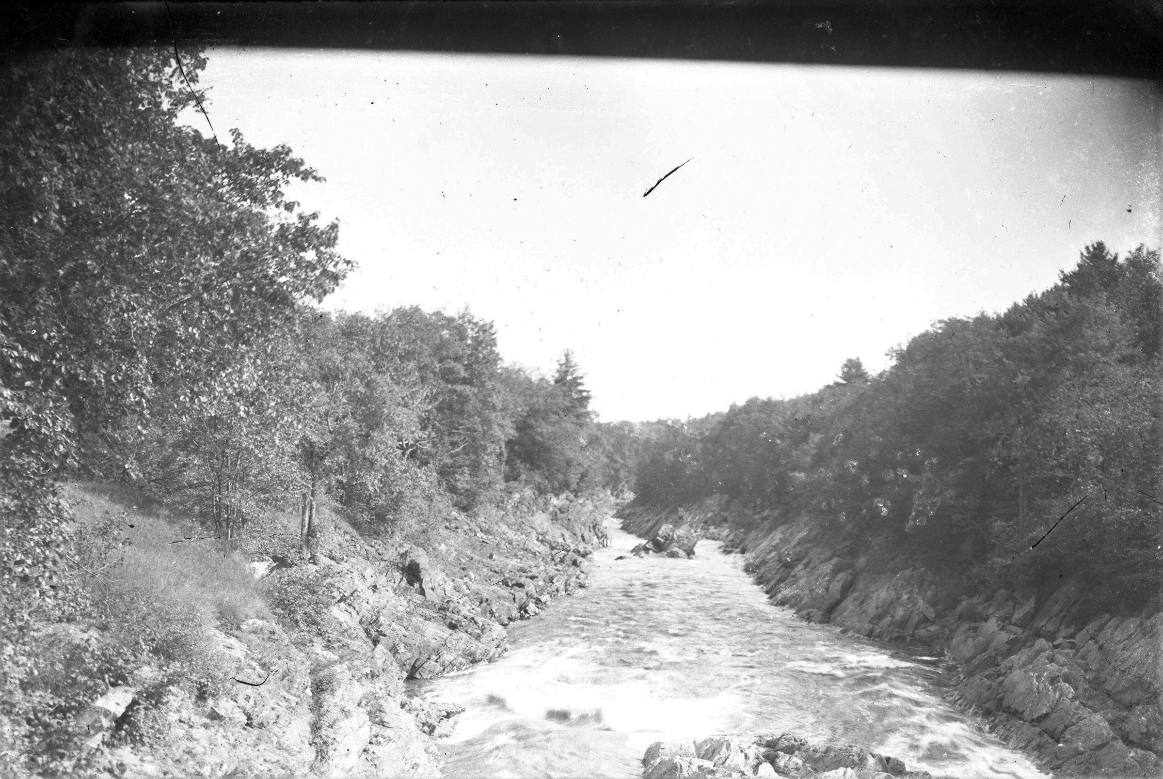 Glass plate negative photo of the Saco River, likely in the Buxton-Hollis area.Made/Created
