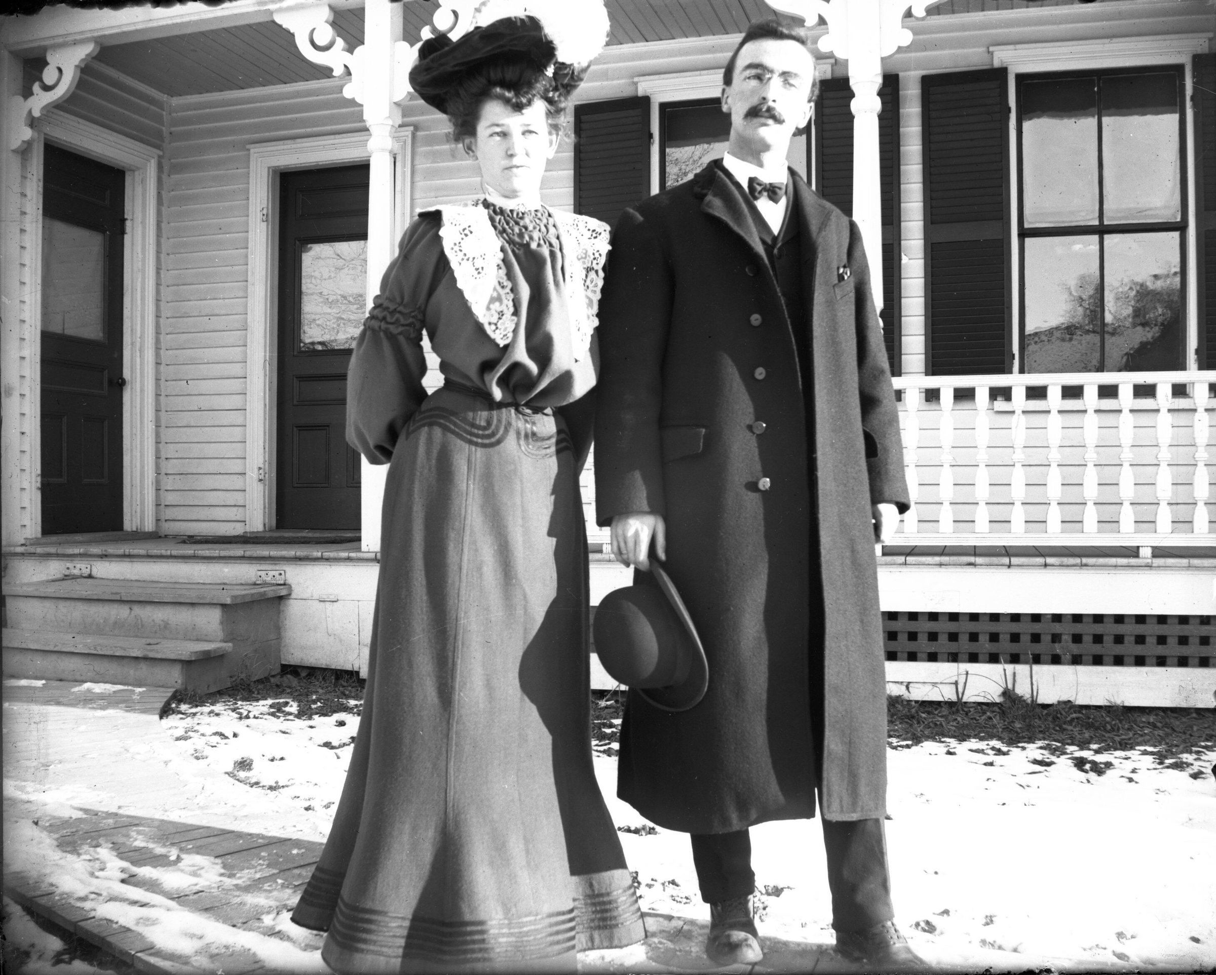 Glass plate negative photo of Eunice Amanda Hobbs Staples and Dr. Ivan W. Staples in the garden at 31 Hill Street, Saco, circa 1908.