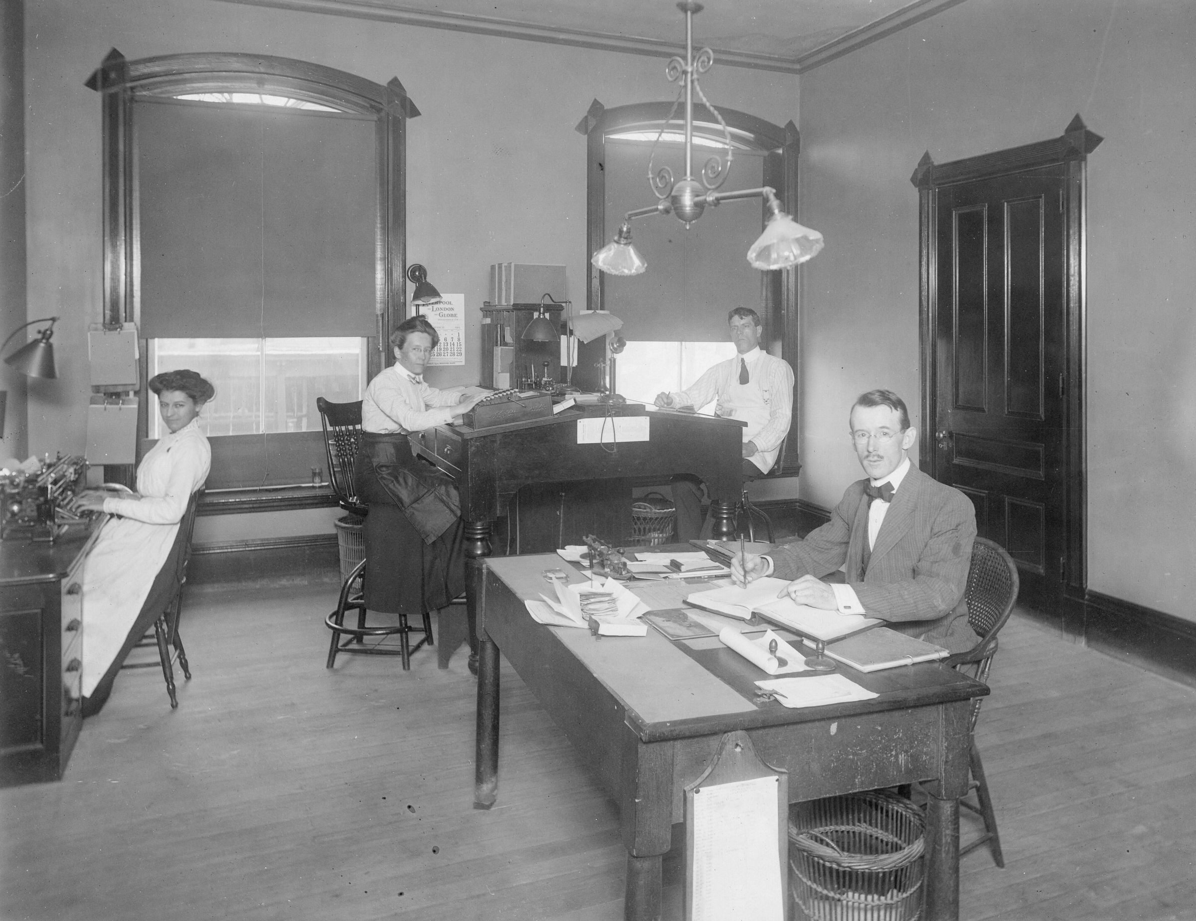 Photograph of workers in an office in the Laconia Division of the Pepperell Manufacturing Company.