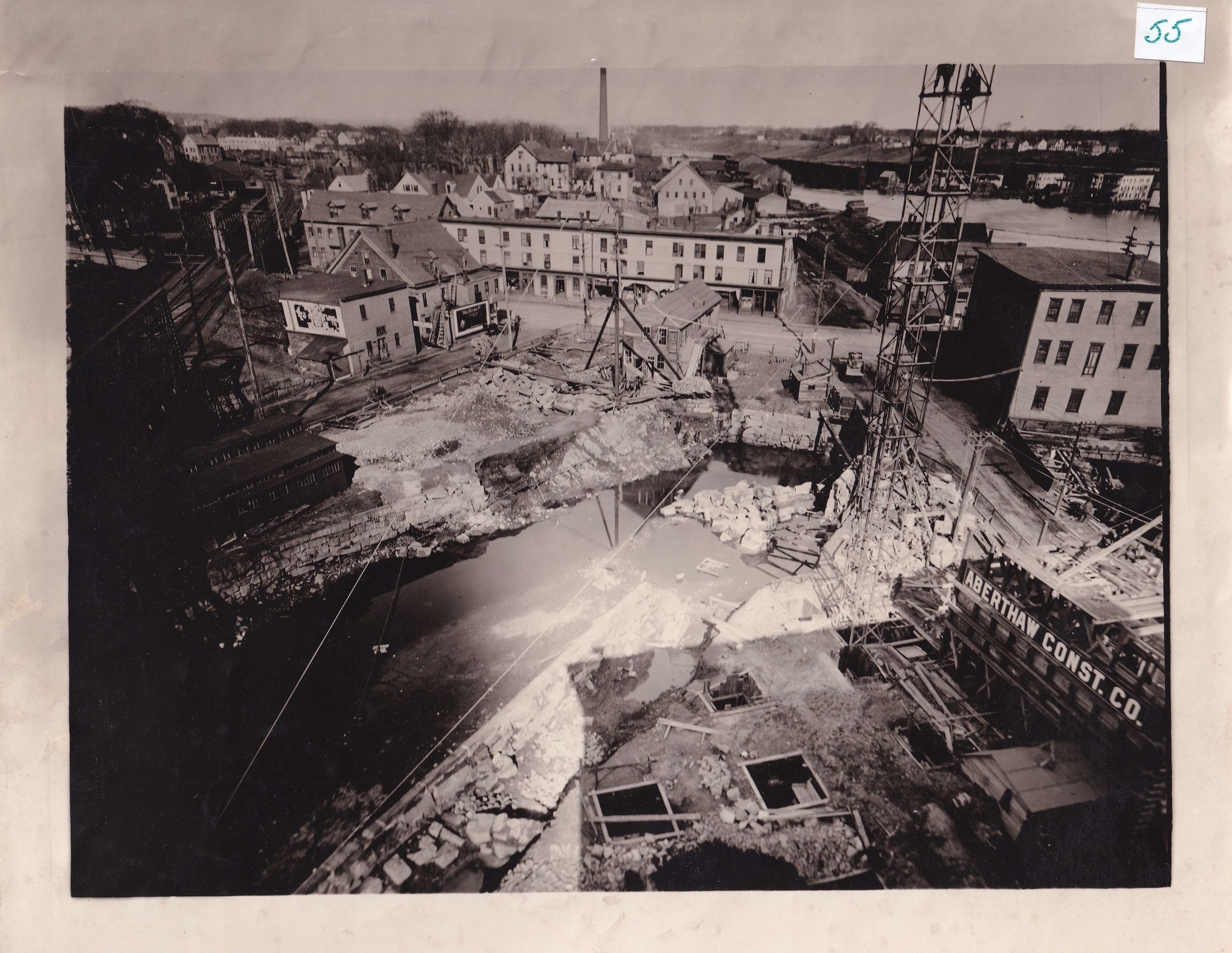 Aerial view of the foundation of the "New Shop" looking west over Elm Street, with the chimney of the Diamond Match factory and Hooper Hill in the background, the Saco River flowing from left to right. The railroad tracks are to the left (Western Division). Abenathy Construction Company, based in Boston, brought a new construction process to this area wherein steel-reinforced concrete was used. J. Vaughan Dennett did this pioneering work.Made/Created