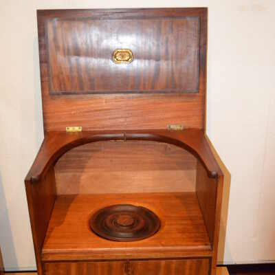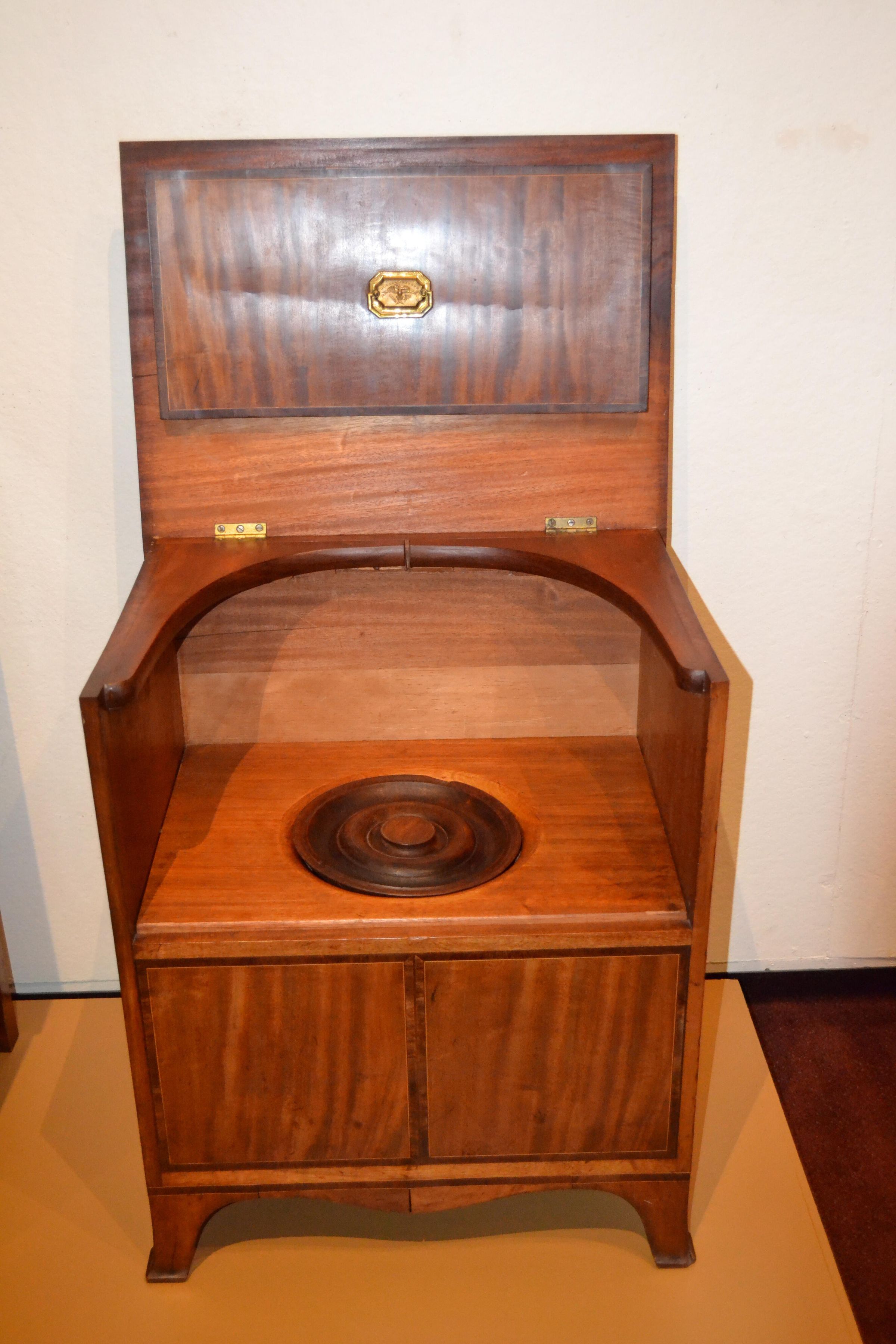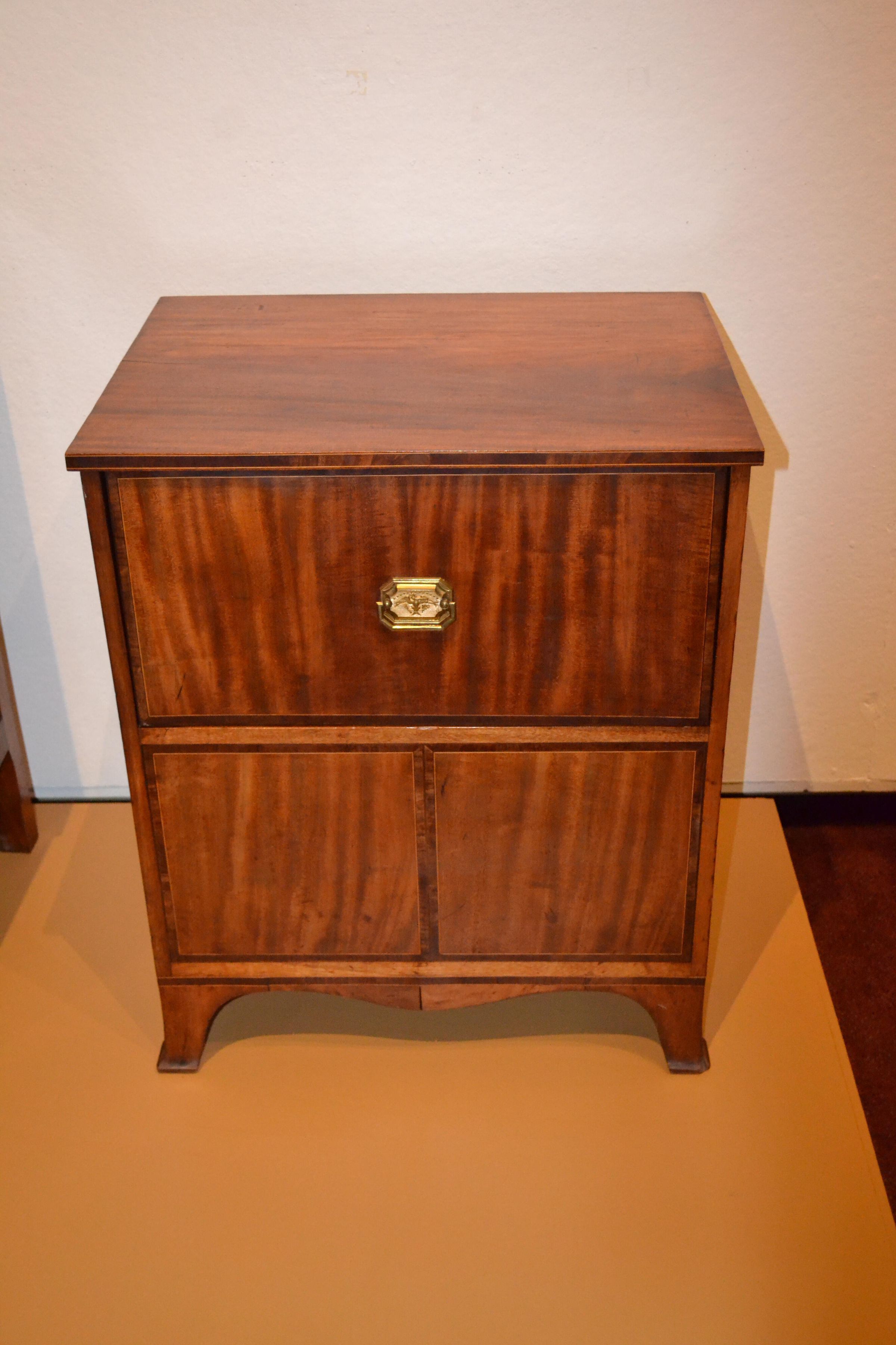 Although when closed it appears to be a cabinet, once this night table's hinged top is lifted and folded back its true purpose is revealed: inside is a seat with a cutout for a commode pot. For nighttime "necessities," using such a seat would have been considerably easier, and more comfortable, than using a chamber pot on the floor. George Hepplewhite illustrated two examples of night tables with lift-up lids in Plate 82 of The Cabinet-Maker and Upholsterer's Guide. The cabinet retains its original brass hardware, which is stamped "H J" for Thomas Hands and William Jenkins of Birmingham, England, a firm that exported a great deal of hardware to America. This handle was clearly intended for the US market with its image of an eagle holding a banner in its beak that reads "E Pluribus Unum." One of the eagle's feet grasps a quiver of arrows while the other holds a bunch of olive branches.