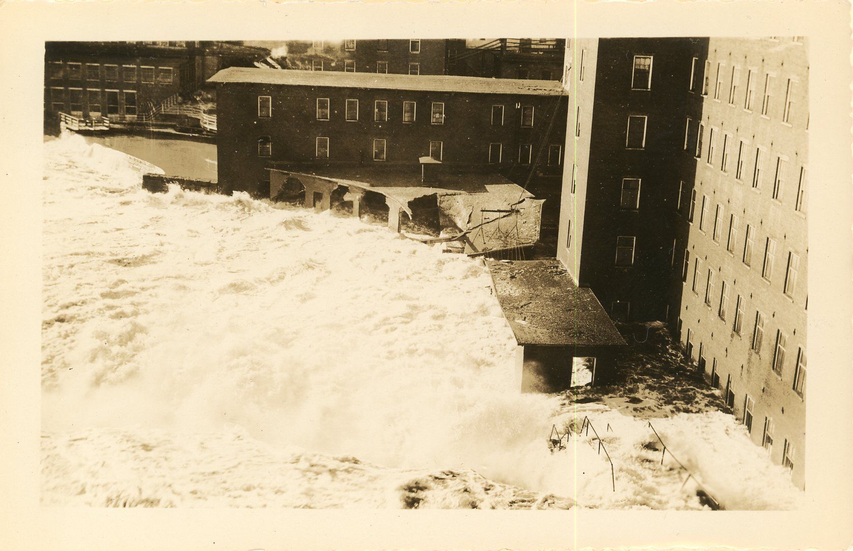Black and white print photograph of Saco River flooding in Saco, Maine near mill buildings. From the Sawyer House Collection.