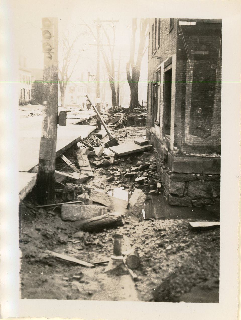 Black and white print photograph of Saco River flooding street damage. From the Sawyer House Collection.