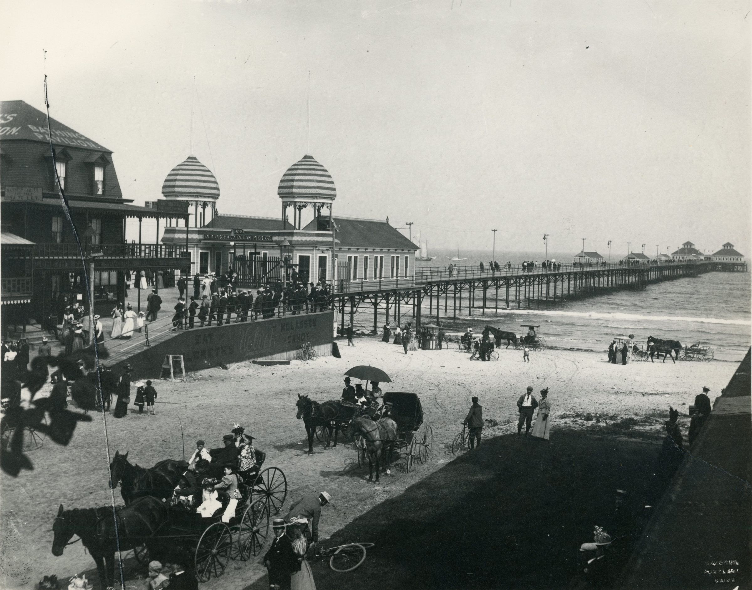 Print photograph (from a glass plate negative) of the entrance to the Old Orchard Pier in Old Orchard Beach. The Bathing Pavilion and a sign for "Velvet Molasses Candy" can be seen.