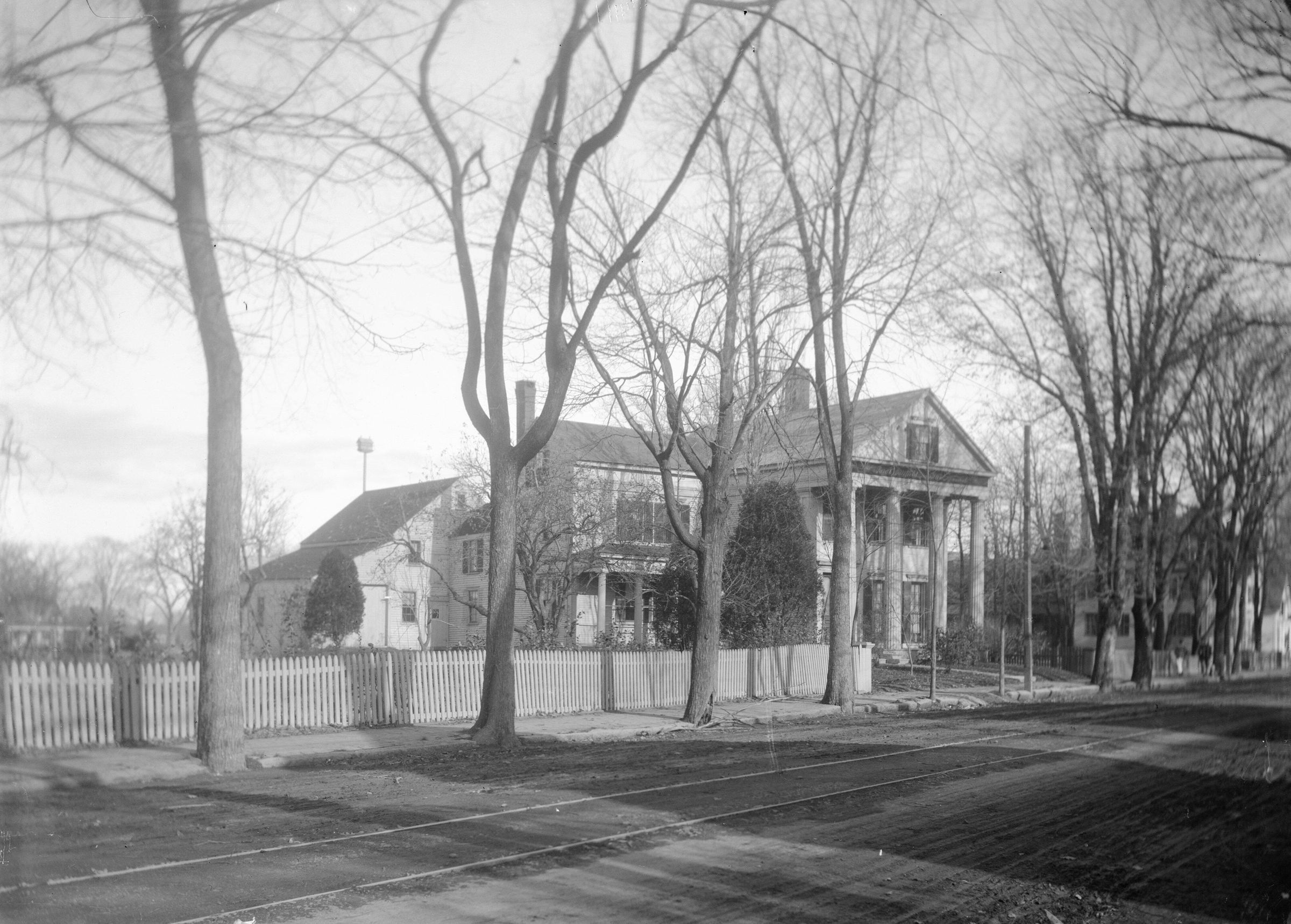 Glass plate negative photo of 42 Beach Street, Saco, ME. Trolley tracks are visible on the street. Formerly known as The Sarah Fairfield Hamilton Memorial Building, named in honor of the founder of the Women's Educational and Industrial Union in Saco in 1911. City records show that the house was originally built in 1854. Some publications have erroneously called the house Hamilton's childhood home. The Fairfield homestead was actually further down Beach Street near Laurel Hill Cemetery. Also, this building is often confused with "Hamilton Hall" on Storer Street, which was used as a gym/athletic center for Thornton Academy.Made/Created
