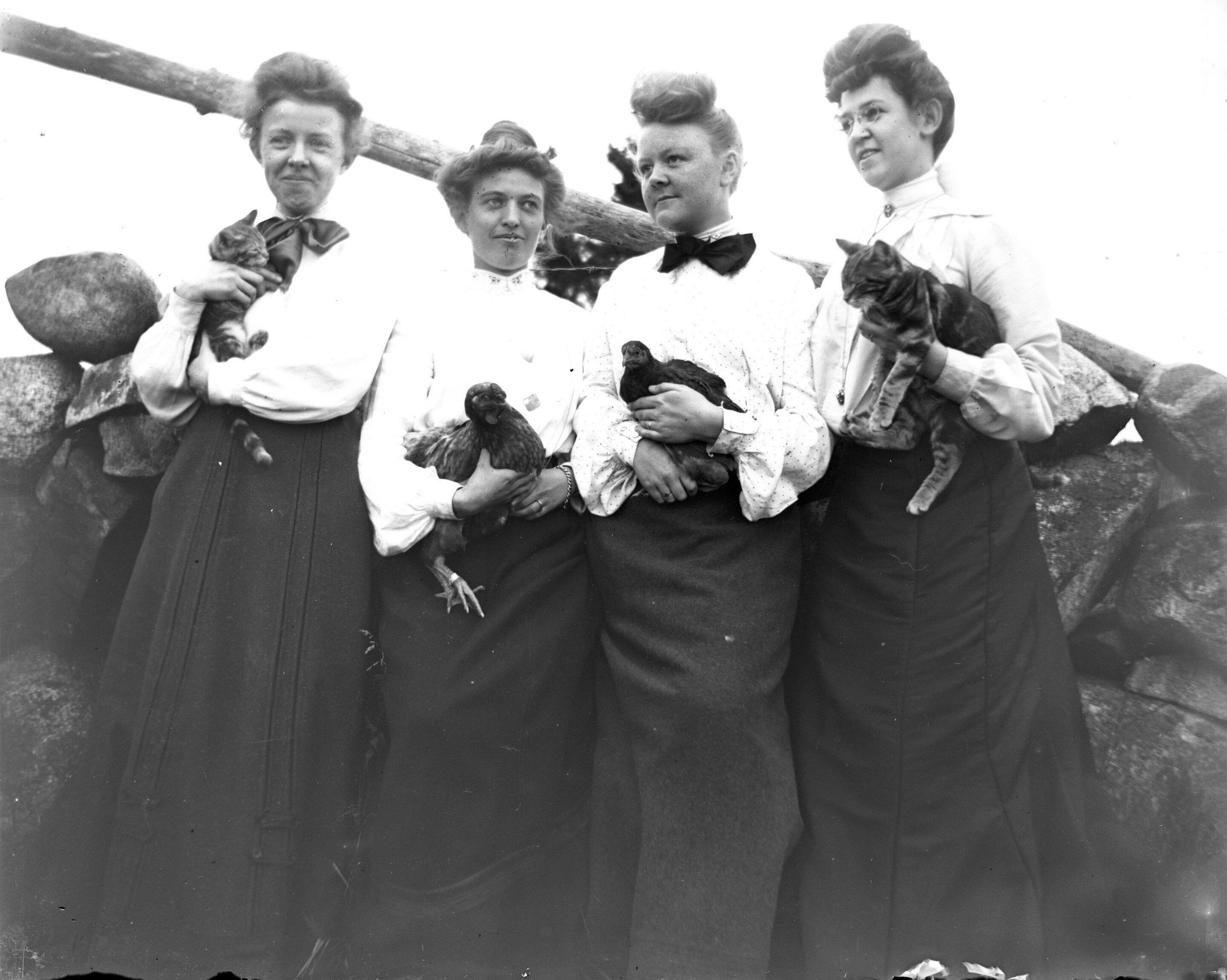 Glass plate negative photo of four unidentified women holding cats and hens.