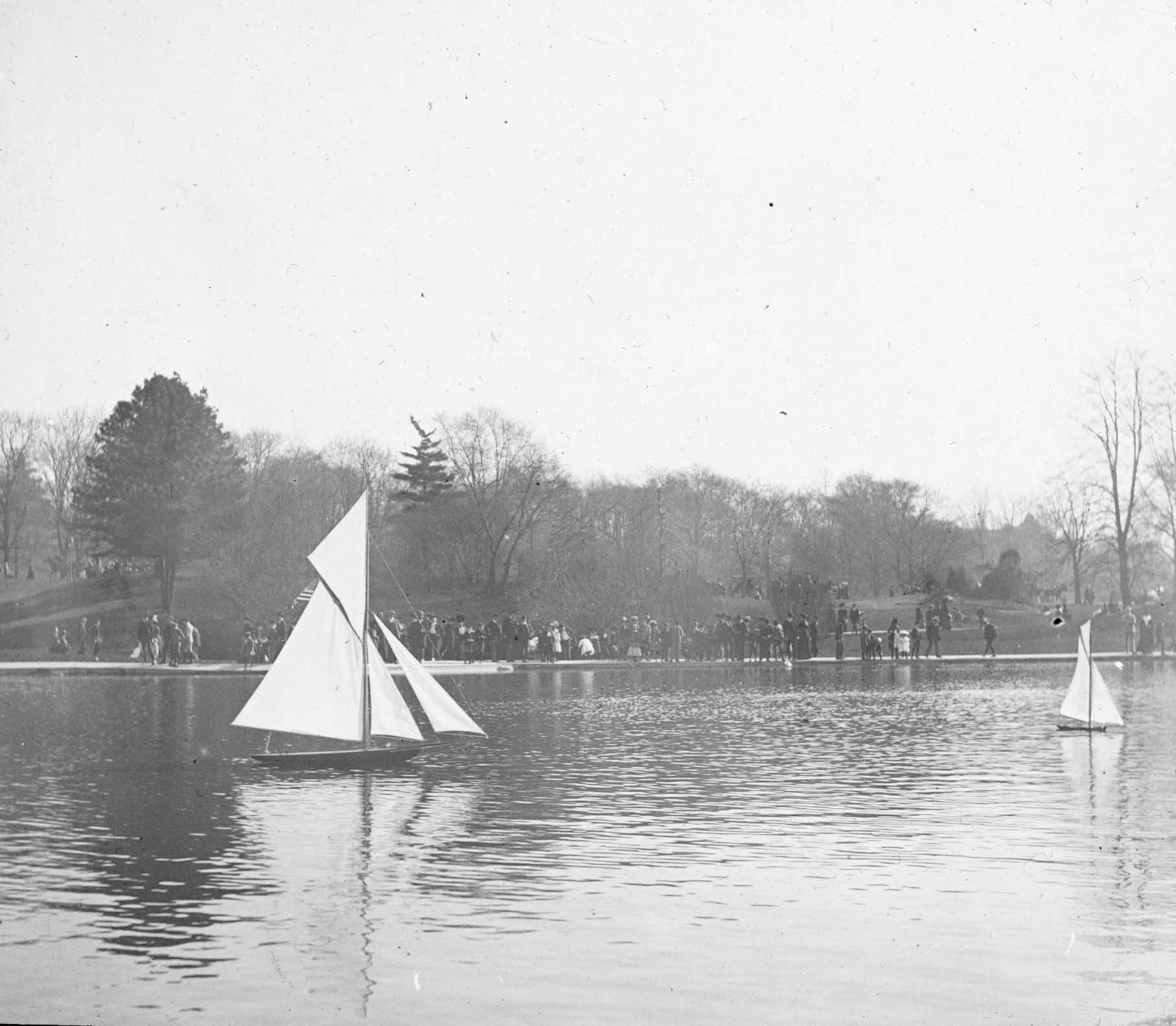 Glass lantern slide of miniature yachts in Central Park, NY. "Miniature yachts, Central Park" is written on the label on the slide.