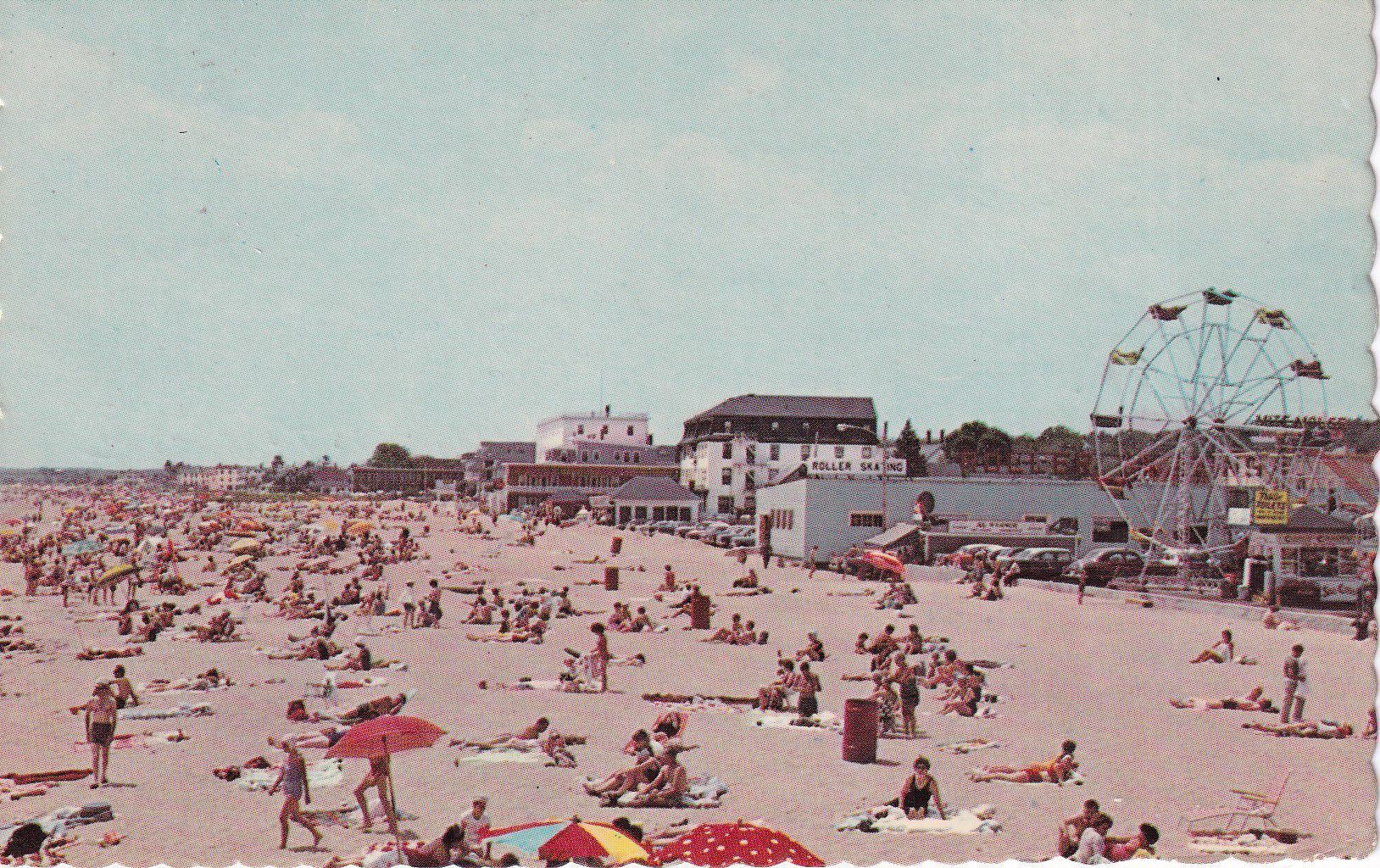 A postcard bearing a color photograph of a crowded beach with a ferris wheel in the background.