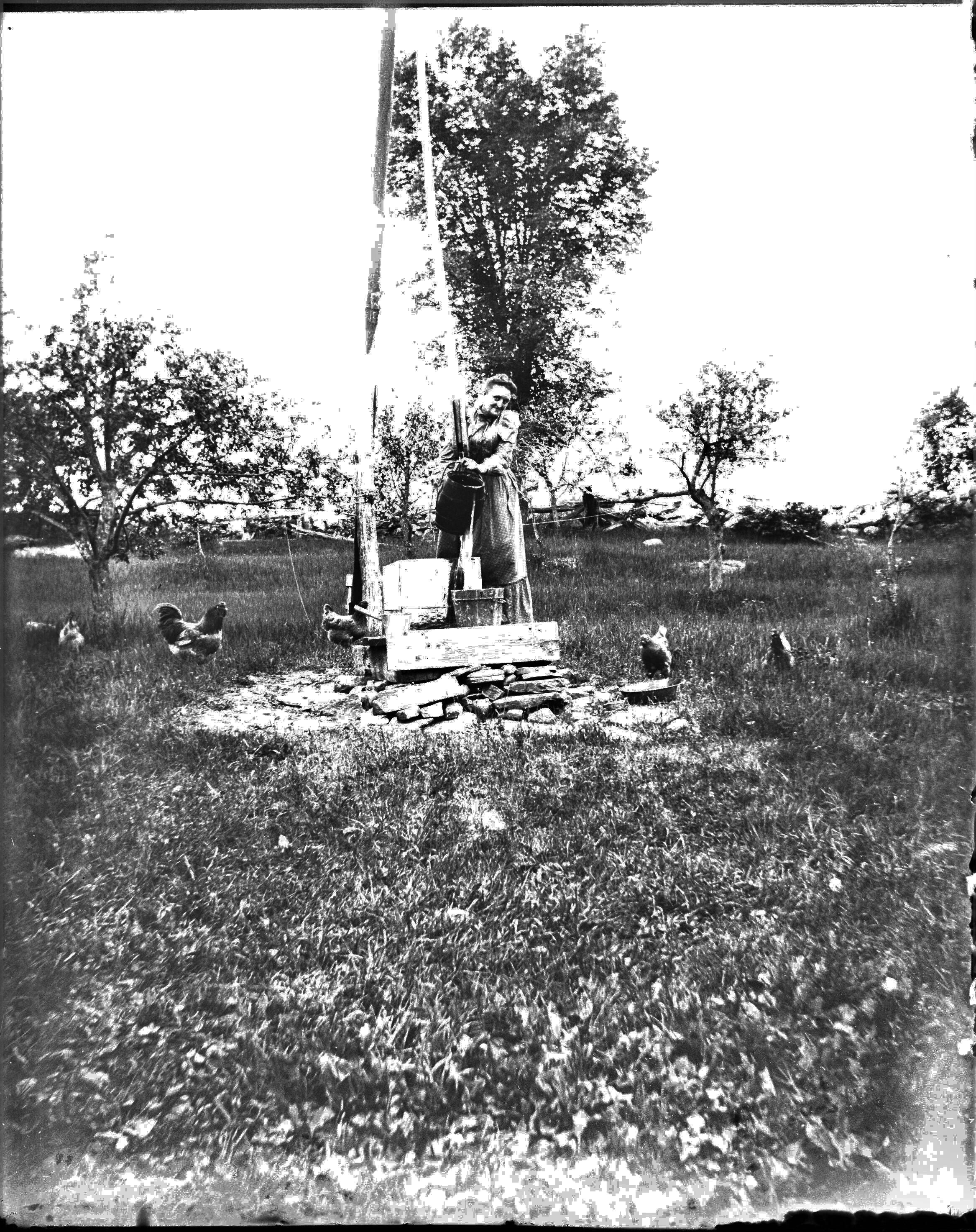 Glass plate negative photo of Minnie Snow Lane (1863-1912) in Limerick, Maine getting water from a well.