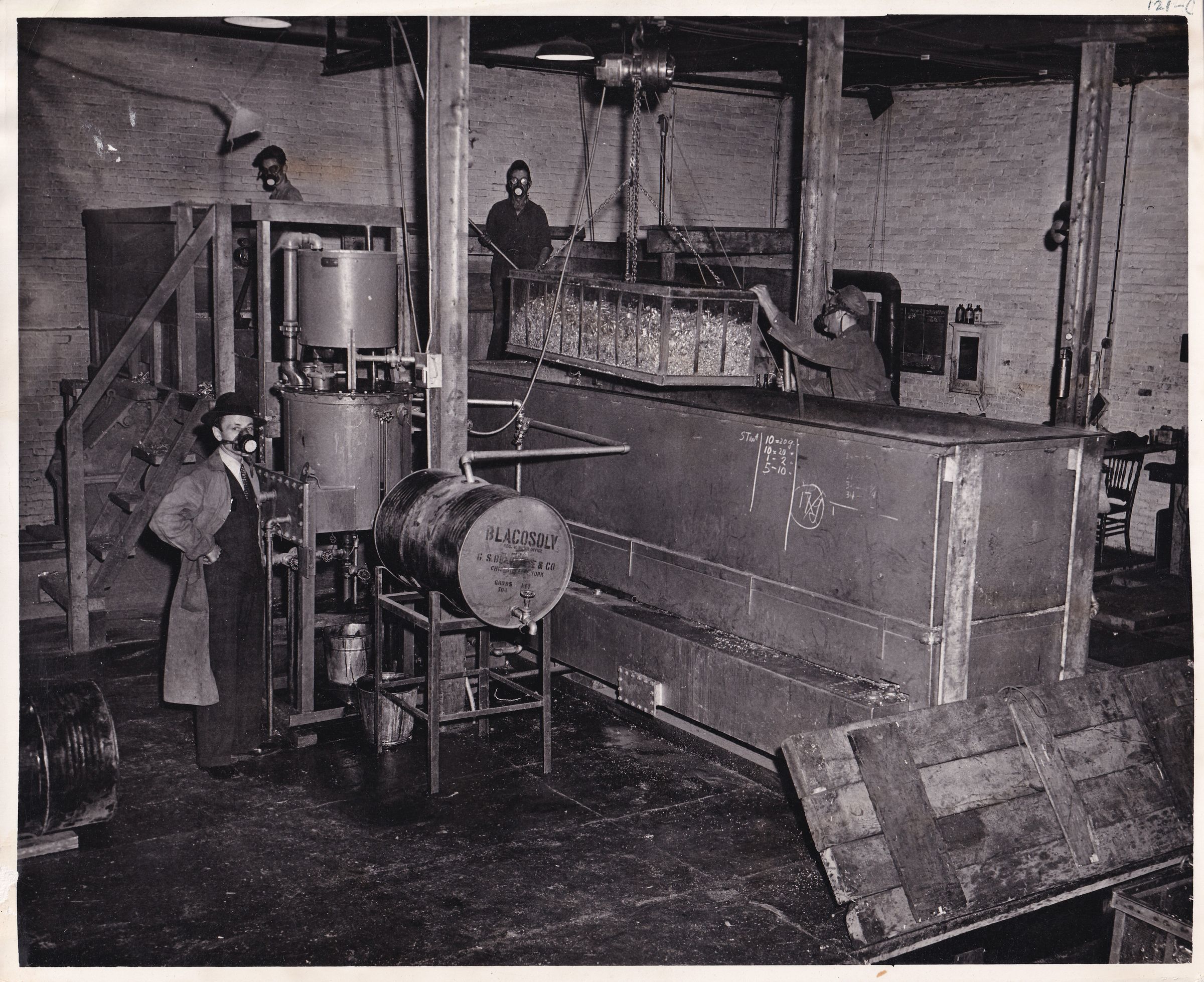 Vasco Da Gama project, 1941-1942. An engineer is converting steel shavings to pellets via a wash and pressing process.Made/Created