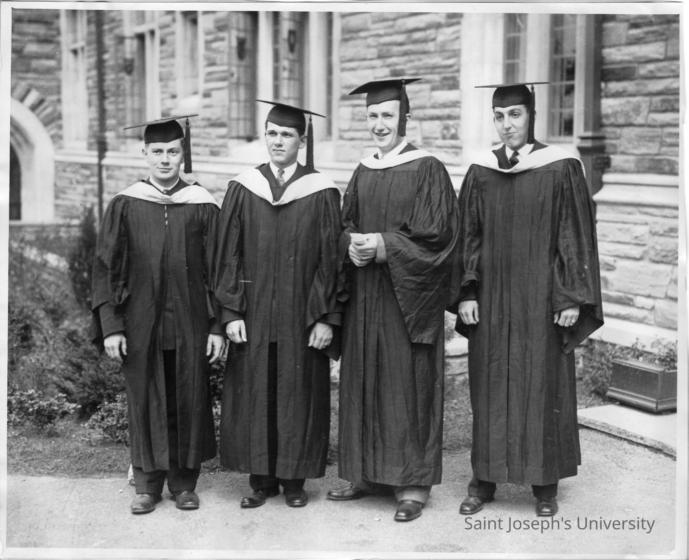 View of four graduates in dressed in cap and gown either before or after 1928 graduation/commencement ceremony.