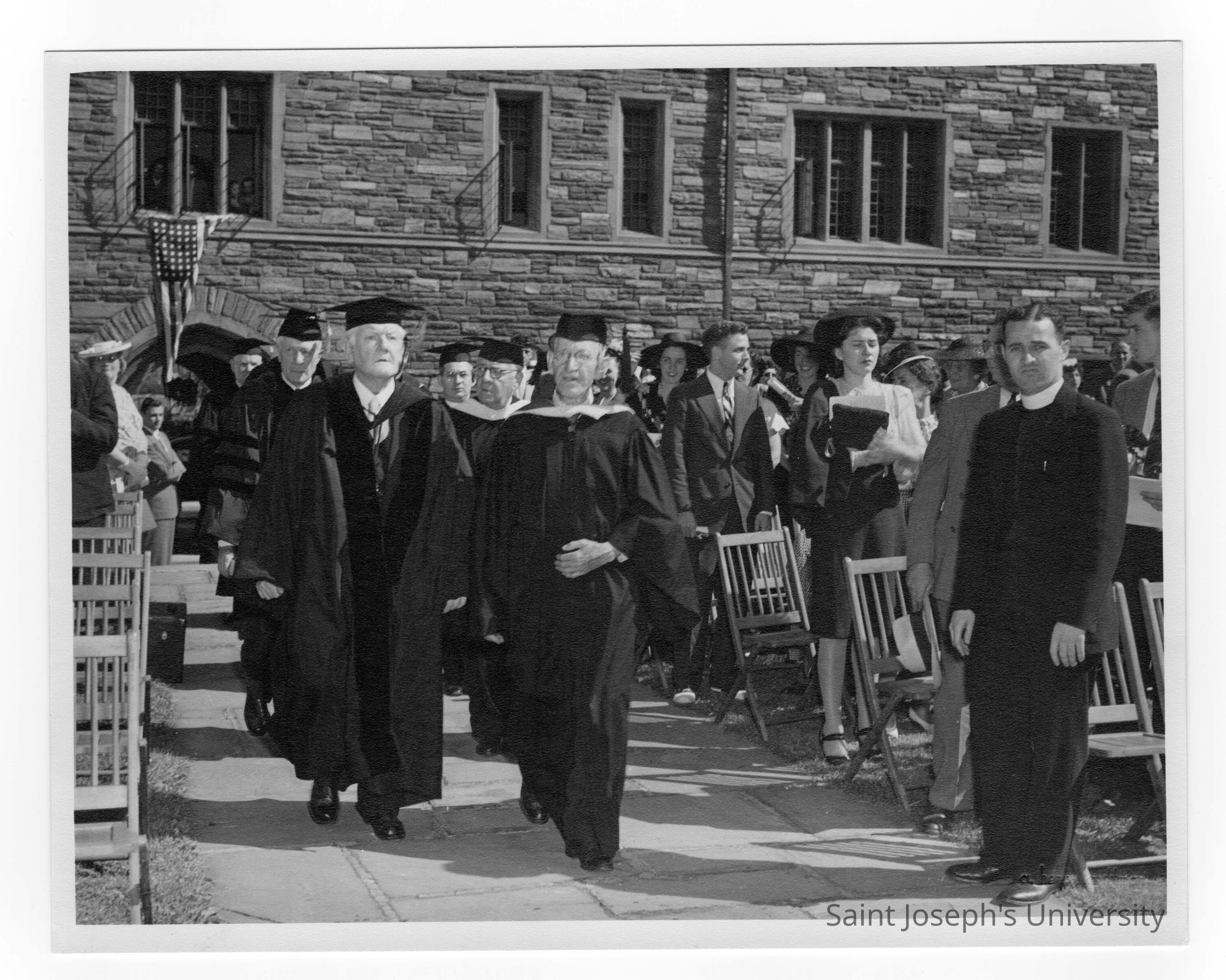 Four graduates from the class of 1896 receiving gold medal awards at 1946 graduation/commencement ceremony processing with others into Barbelin Quadrangle. Alumni included: John J. Sullivan, Samuel J. Magarge, John T. Heron, J. Vincent Crowne.