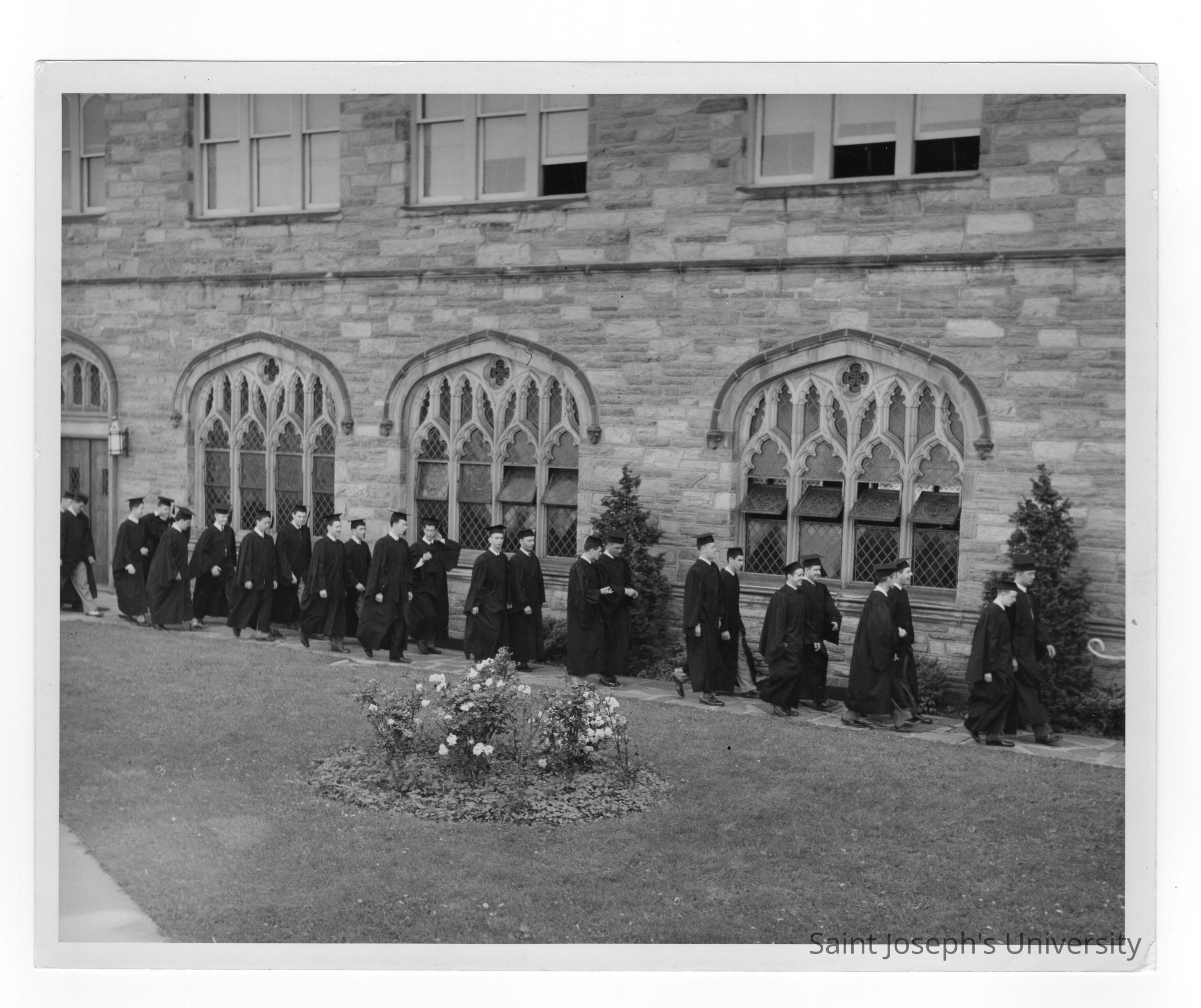 Students dressed in cap and gown prcessing outside Saint Barbara's Church for Baccalaureate service as part of 1947 graduation/commencement ceremony.Entry/Object ID