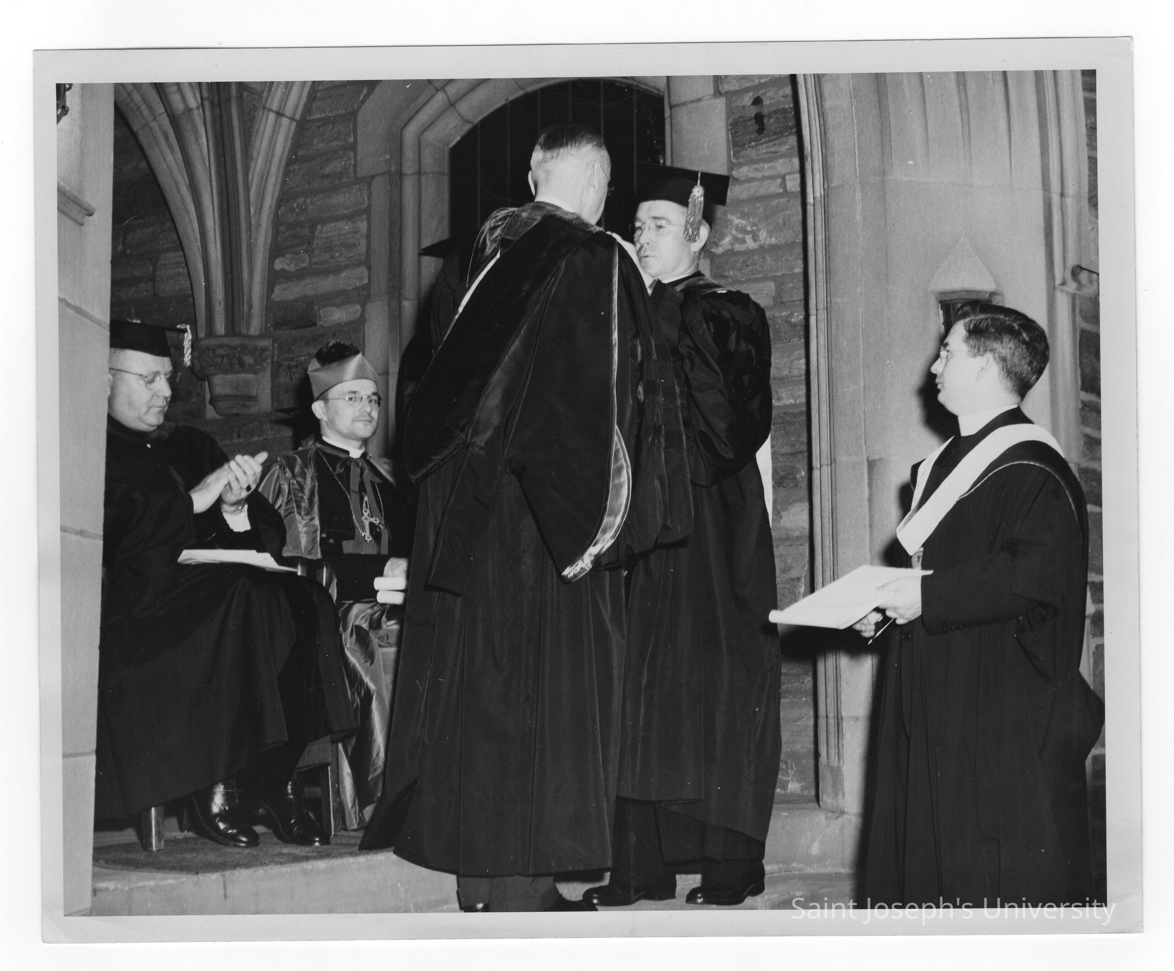 Honorary degree being awarded to Judge Vincent A. Carroll by John J. Long, S.J. during 1947 graduation/commencement ceremony. Other in photograph include: Bishop Carroll McCormick, Father Drane, and Dr. Distler.Entry/Object ID