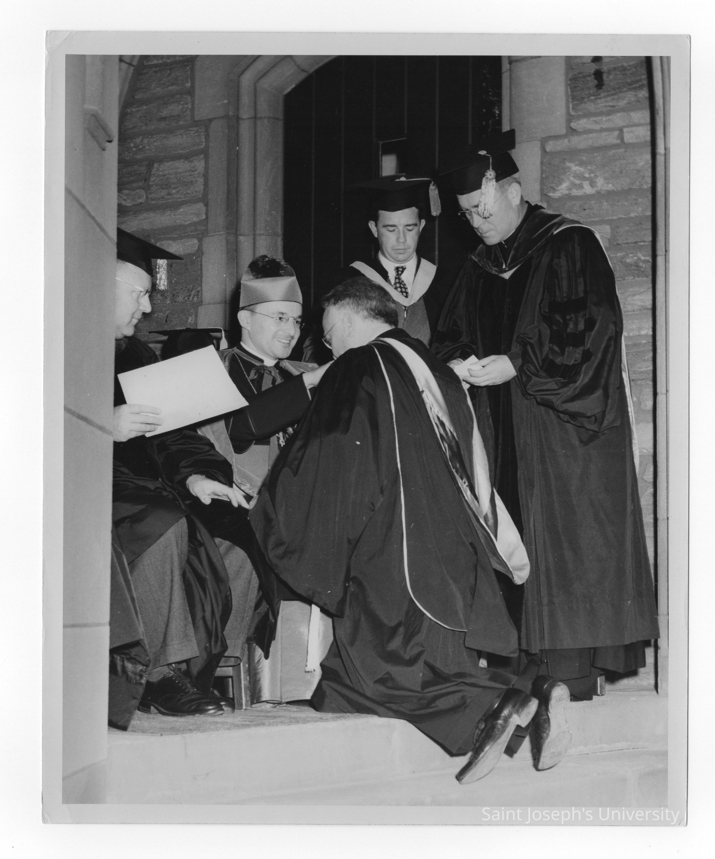 John J. O' Connor, S.J. kisses ring of Bishop Carroll McCormick during 1947 graduation/commencement ceremony. Others in photograph include: John J. Long, S.J., Dr. Distler, and Michael P. Boland?Entry/Object ID