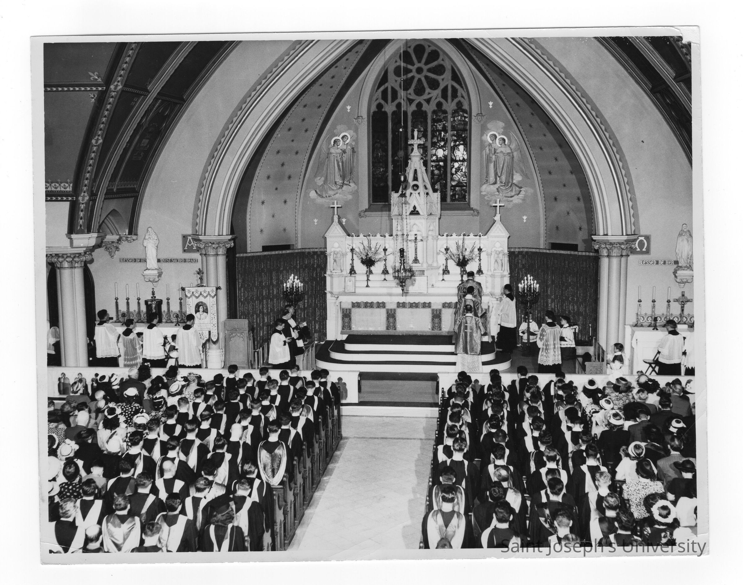 Interior view of Baccalaureate service at Our Lady of Lourdes Church as part of 1948 graduation/commencement service.