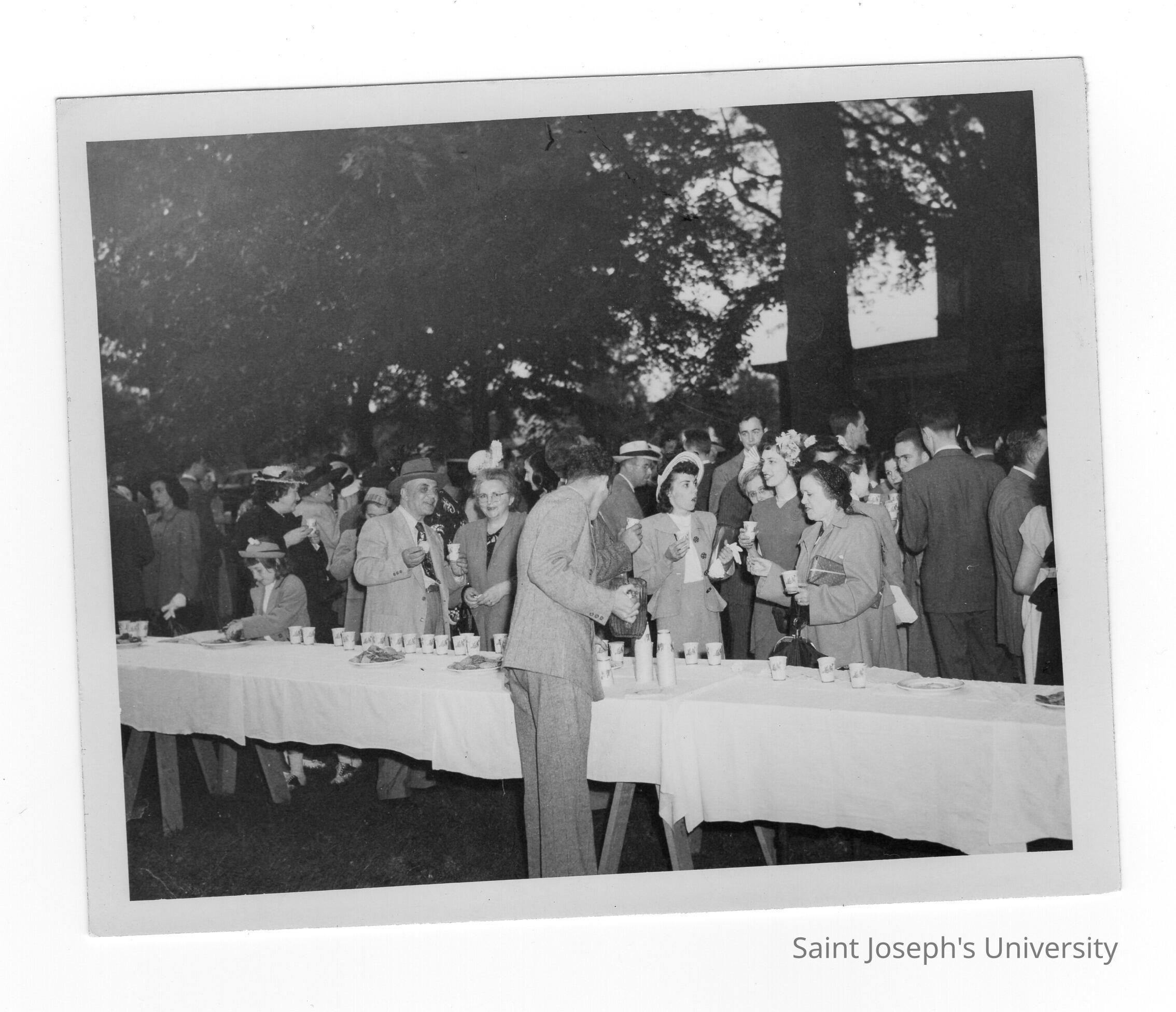 Guests attending 1948 graduation/commencement ceremony eating and drinking at outdoor reception after ceremony.