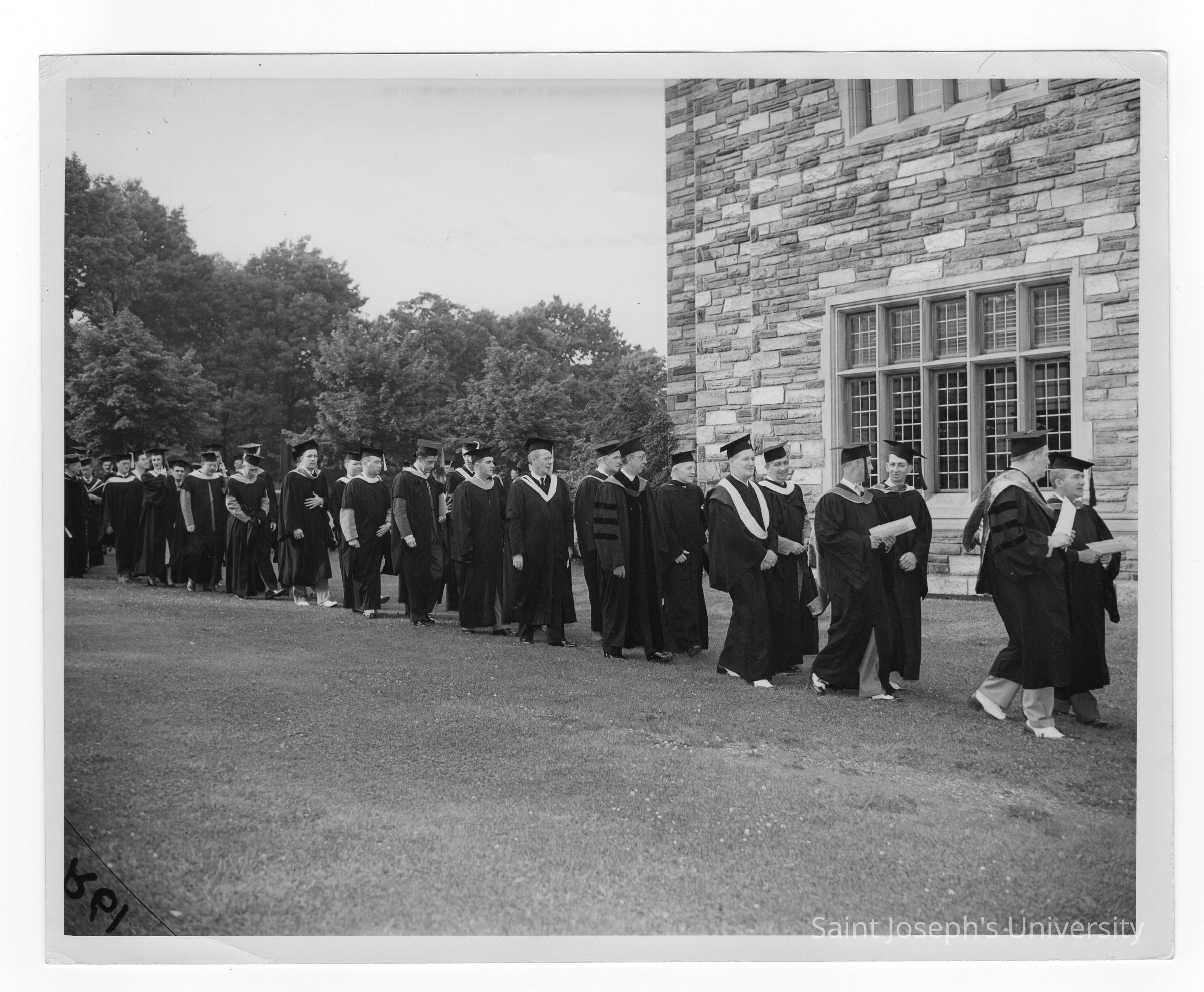 Faculty processing toward Barbelin quadrangle during 1948 graduation/commencement ceremony.