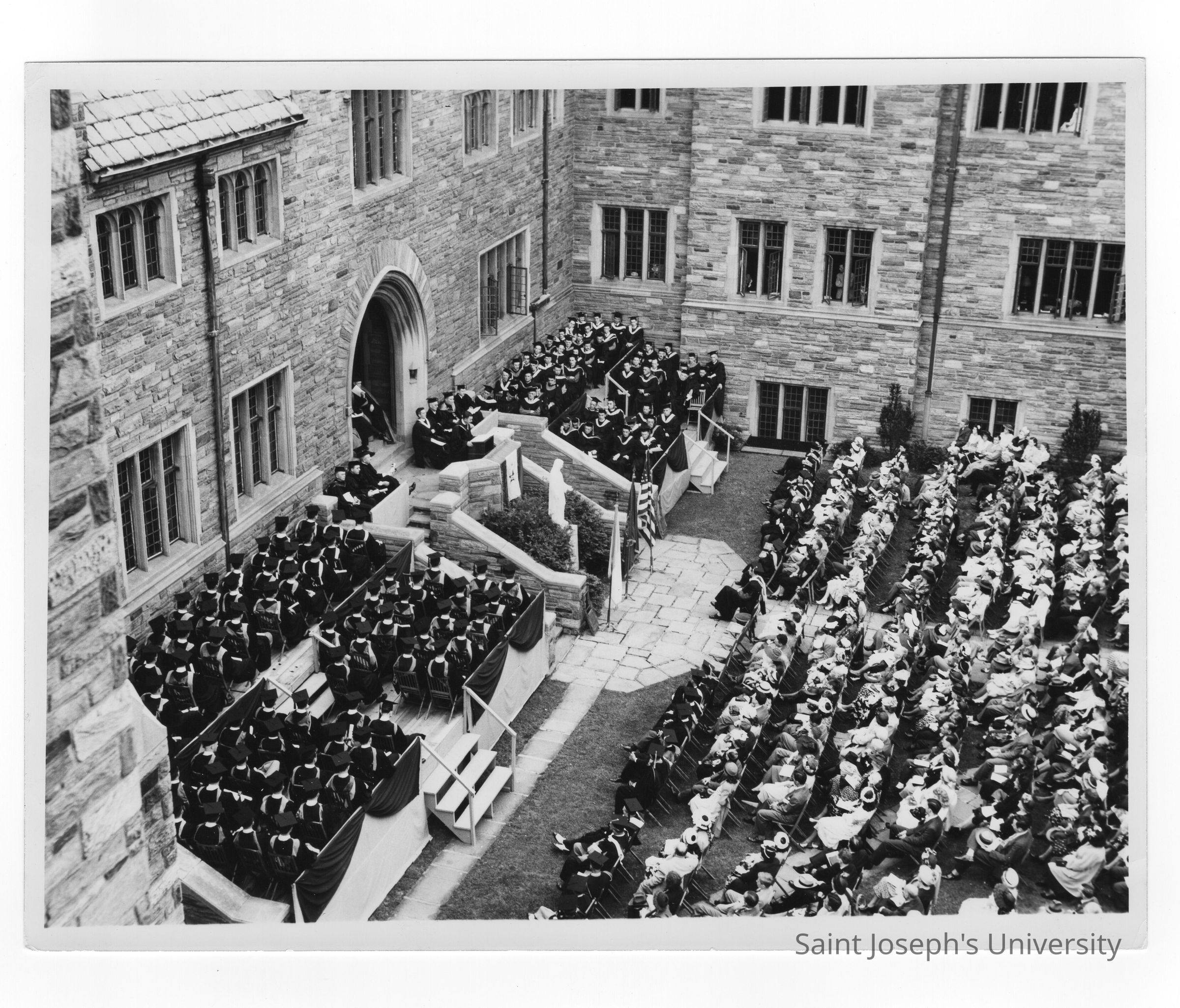 View of 1948 graduation/commencement ceremony in Barbelin quadrangle.