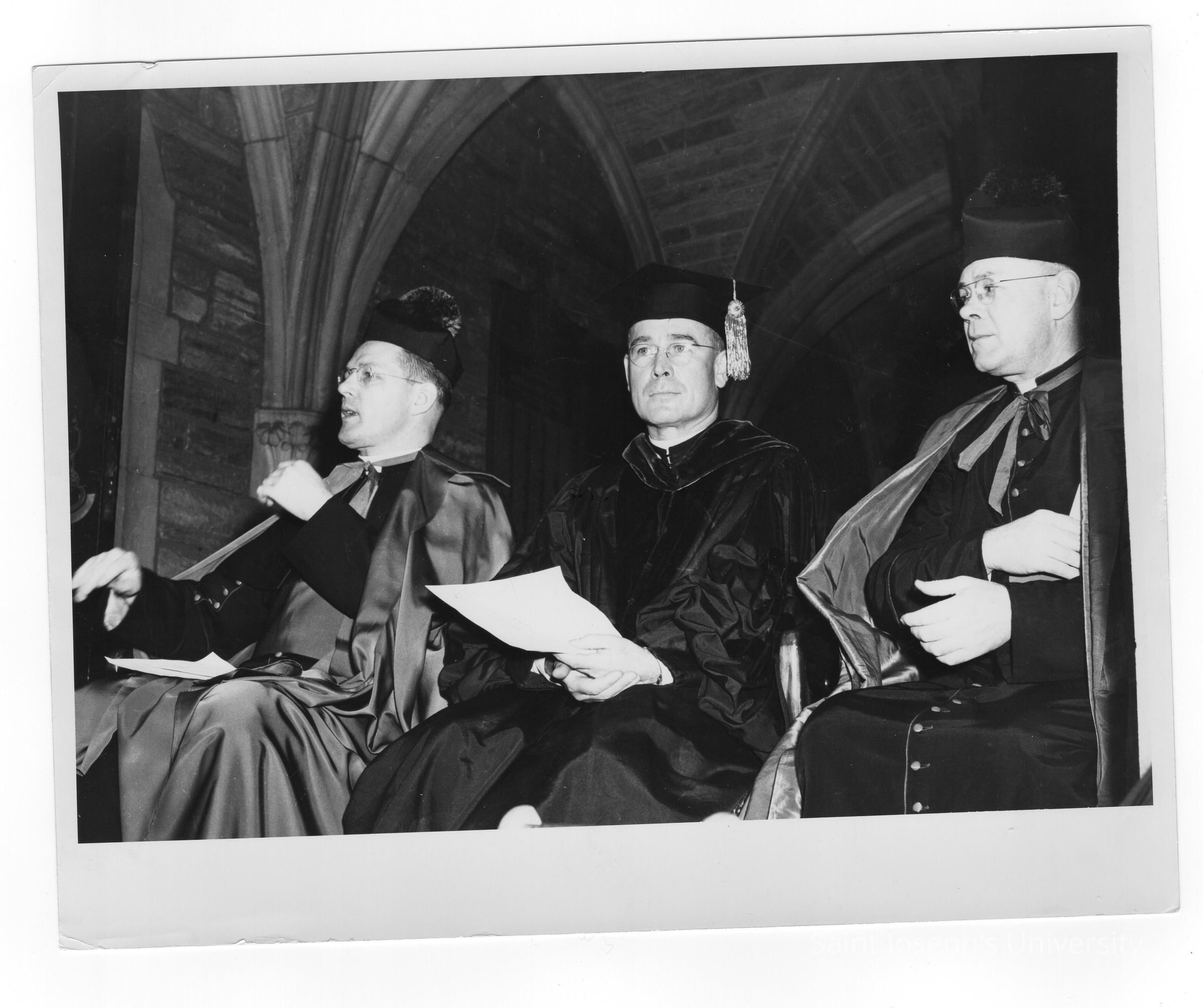 John J. Long, S.J. and two other dignitaries at 1948 graduation/commencement ceremony.