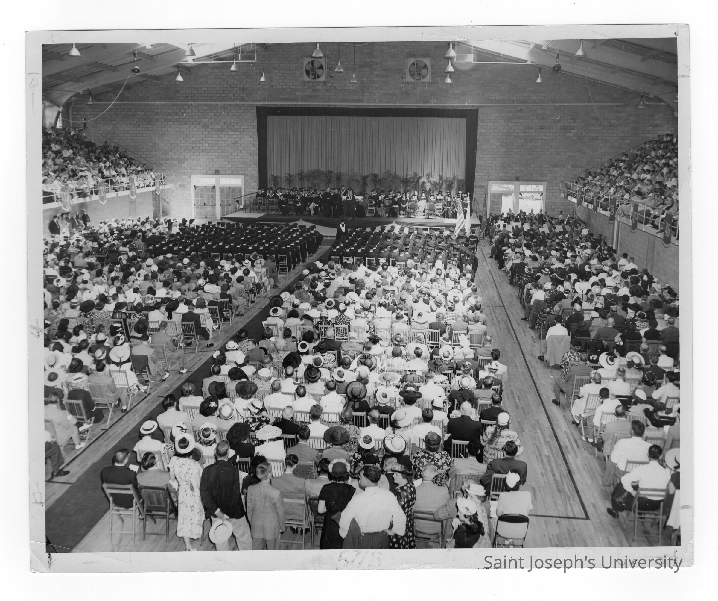 View of 1949 graduation/commencement ceremony in Field House, the first time event held in the Field House.
