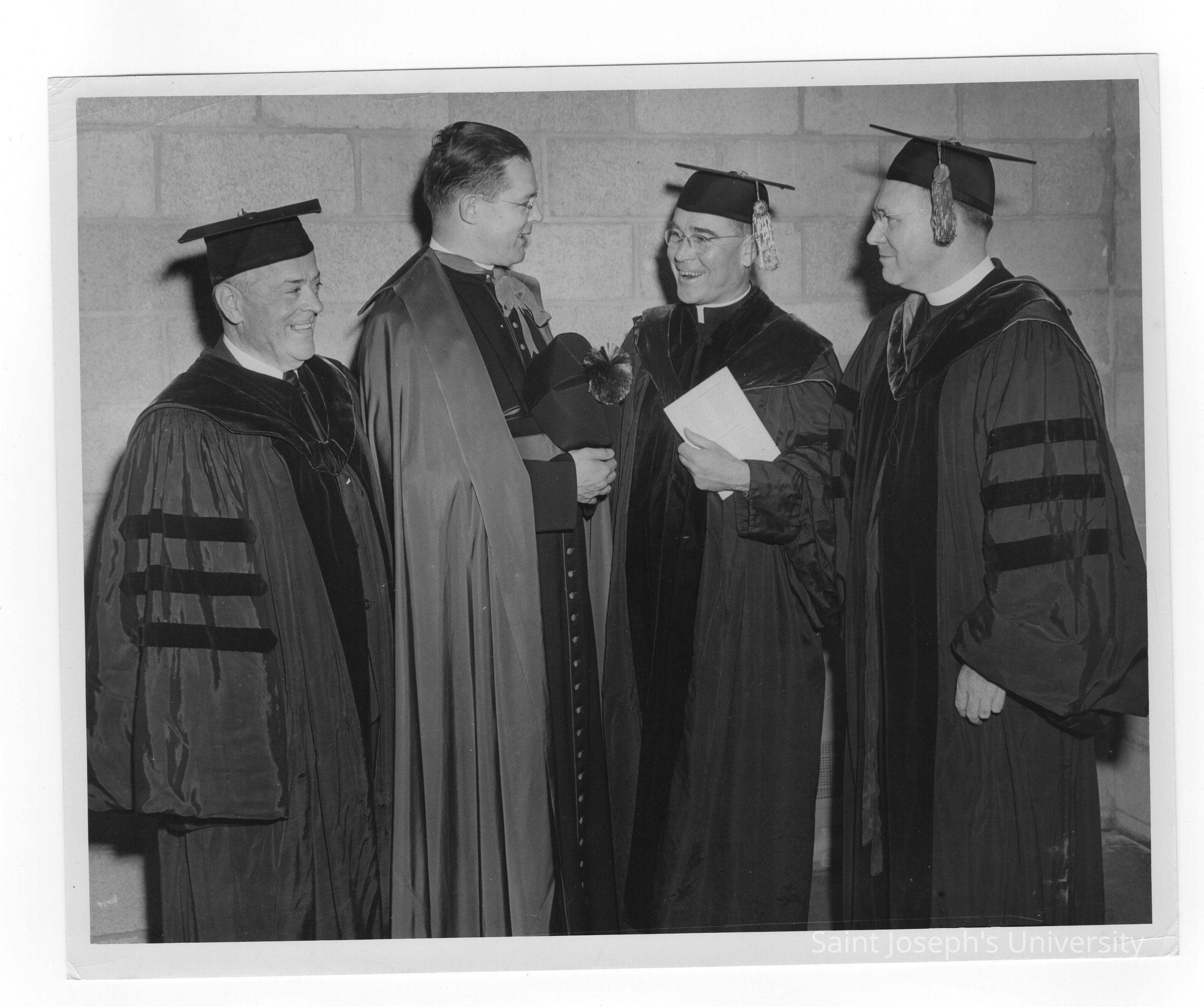 John J. Long, S.J. with honorary degree recipients as part of 1949 graduation/commencement ceremony. Other individuals include Joseph Breen, Monsignor Fury, and Father Cox.Entry/Object ID