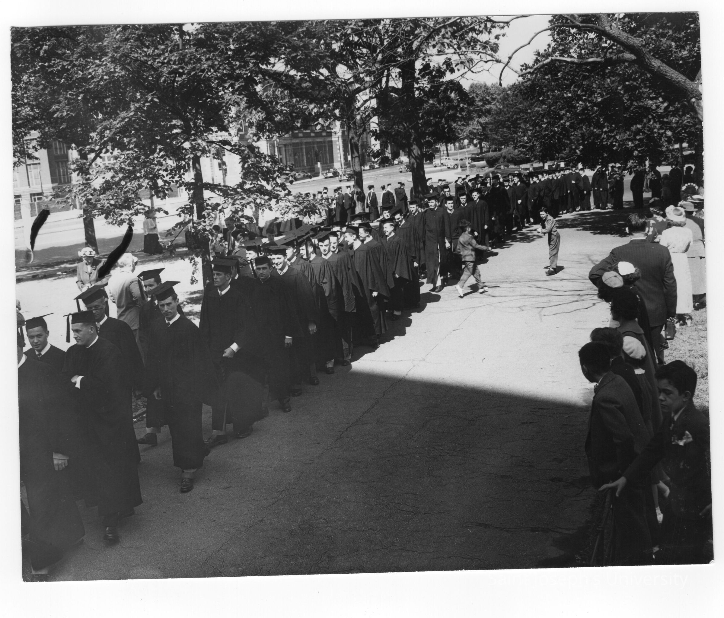 Students in cap and gown processing into cathedral for Baccalaureate service as part of 1950 graduation/commencement.