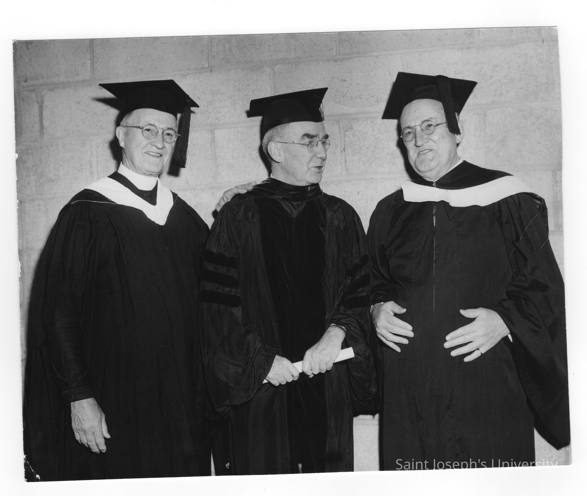 Joseph S. Hogan, S.J. with two alumni from class of 1900 receiving golden hawk awards as part of 1950 graduation/commencement ceremony. Alumni include Reverend Daniel Lawless and John McCusker.