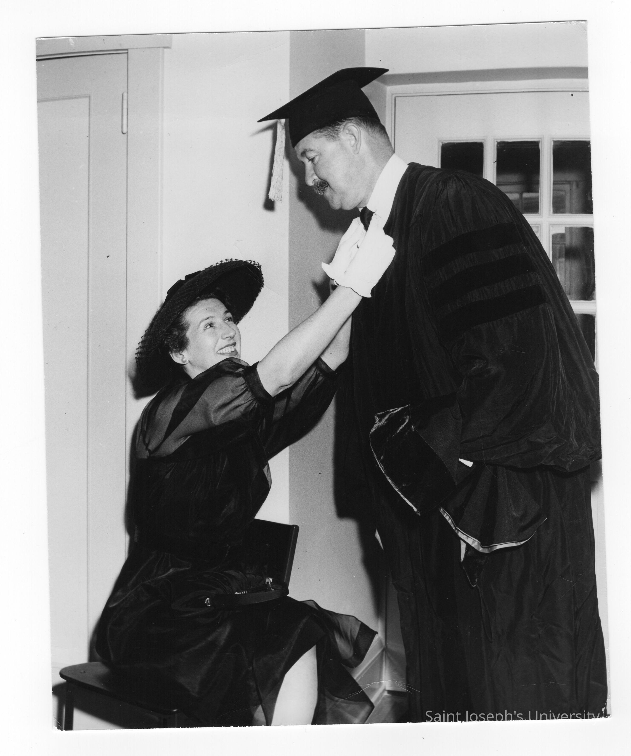 Honorary Degree recipient, Thomas F. Murphy and his wife at 1950 graduation/commencement ceremony.