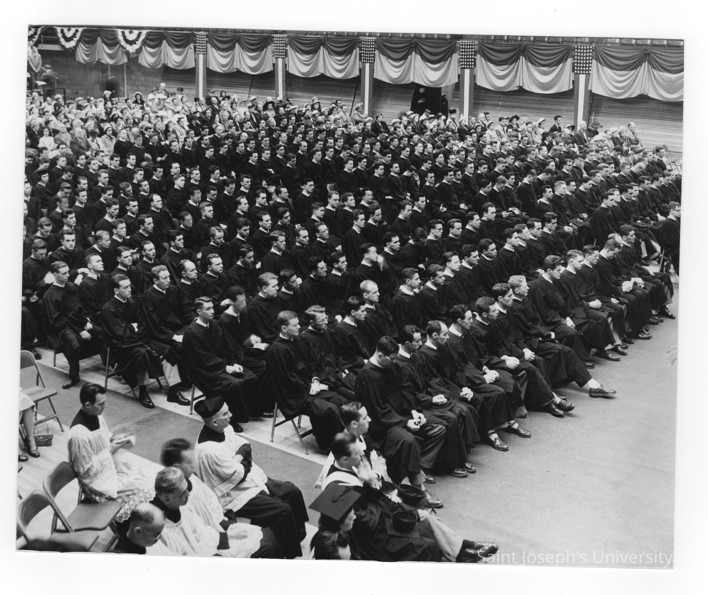 View of students, guests, and Jesuits at Baccalareate service in Field House as part of 1951 graduation/commencement.