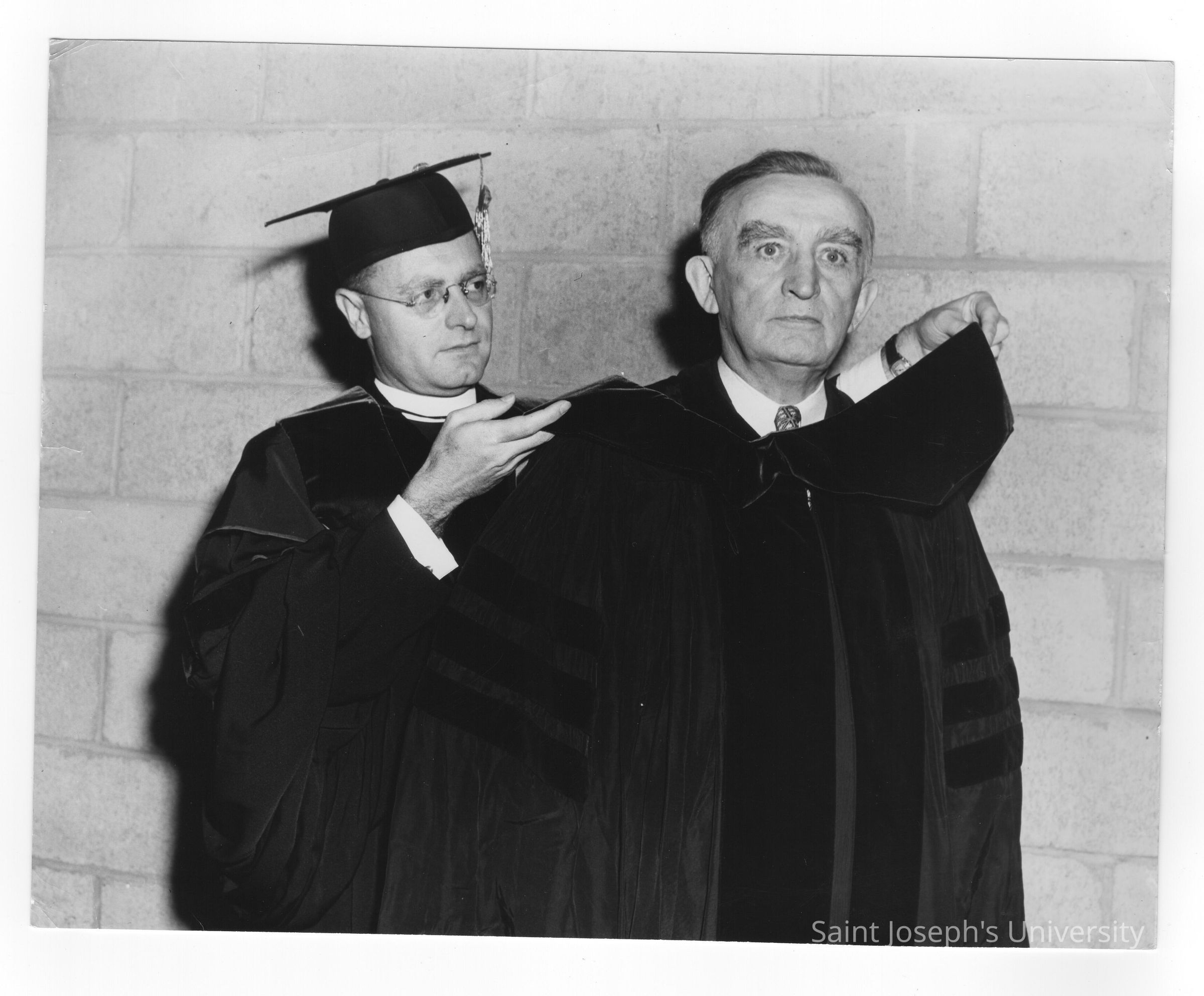 Edward G. Jacklin, S.J., with honorary degree recipient, Senator Joseph C. O'Mahoney at 1951 graduation/commencement.