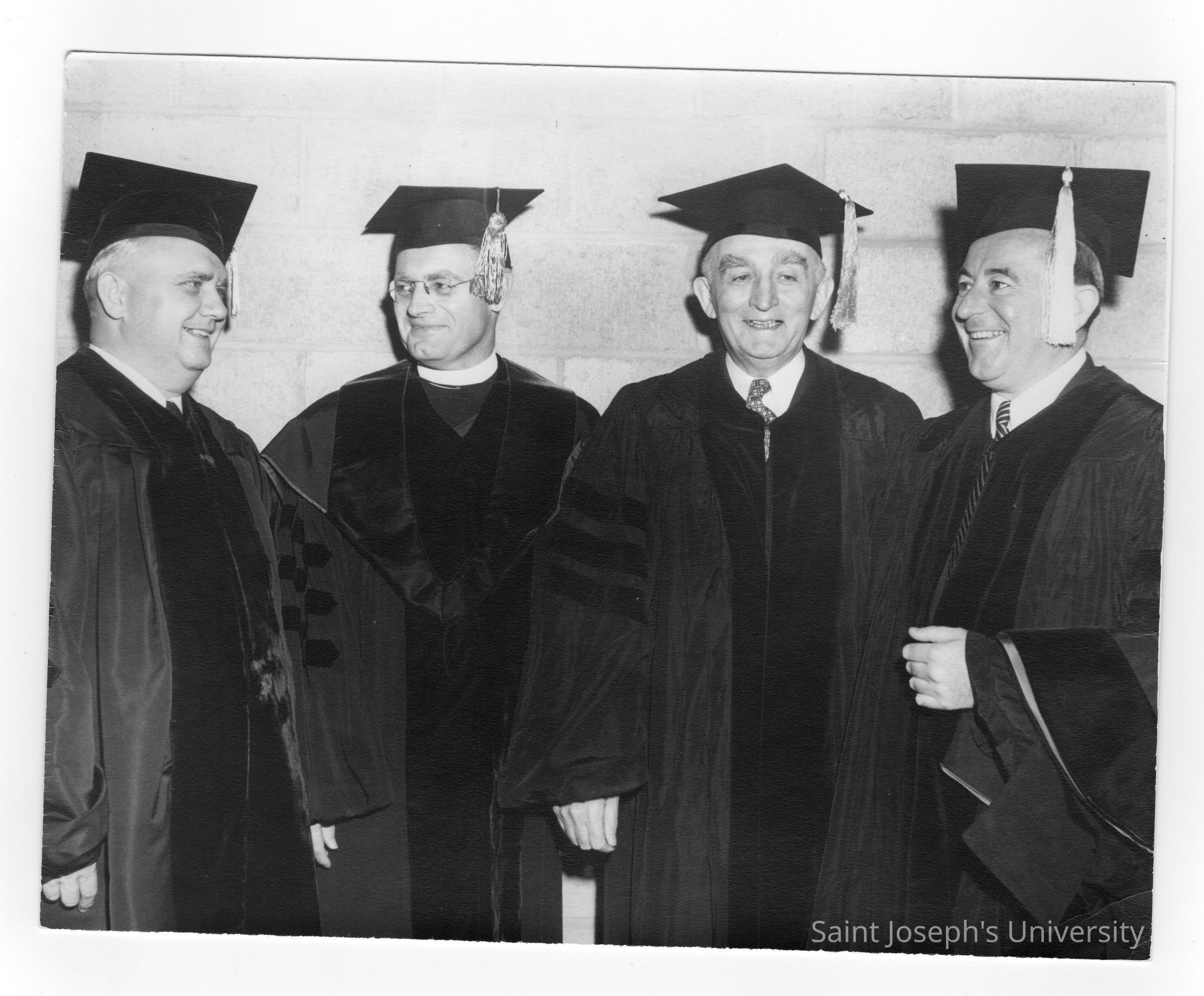 Edward G. Jacklin, S.J., with three honorary degree recipients, U.S. Representative William J. Green, Jr., George A Bennett, Joseph C. O'Mahoney during 1951 graduation/commencement. (Three black and white prints.)