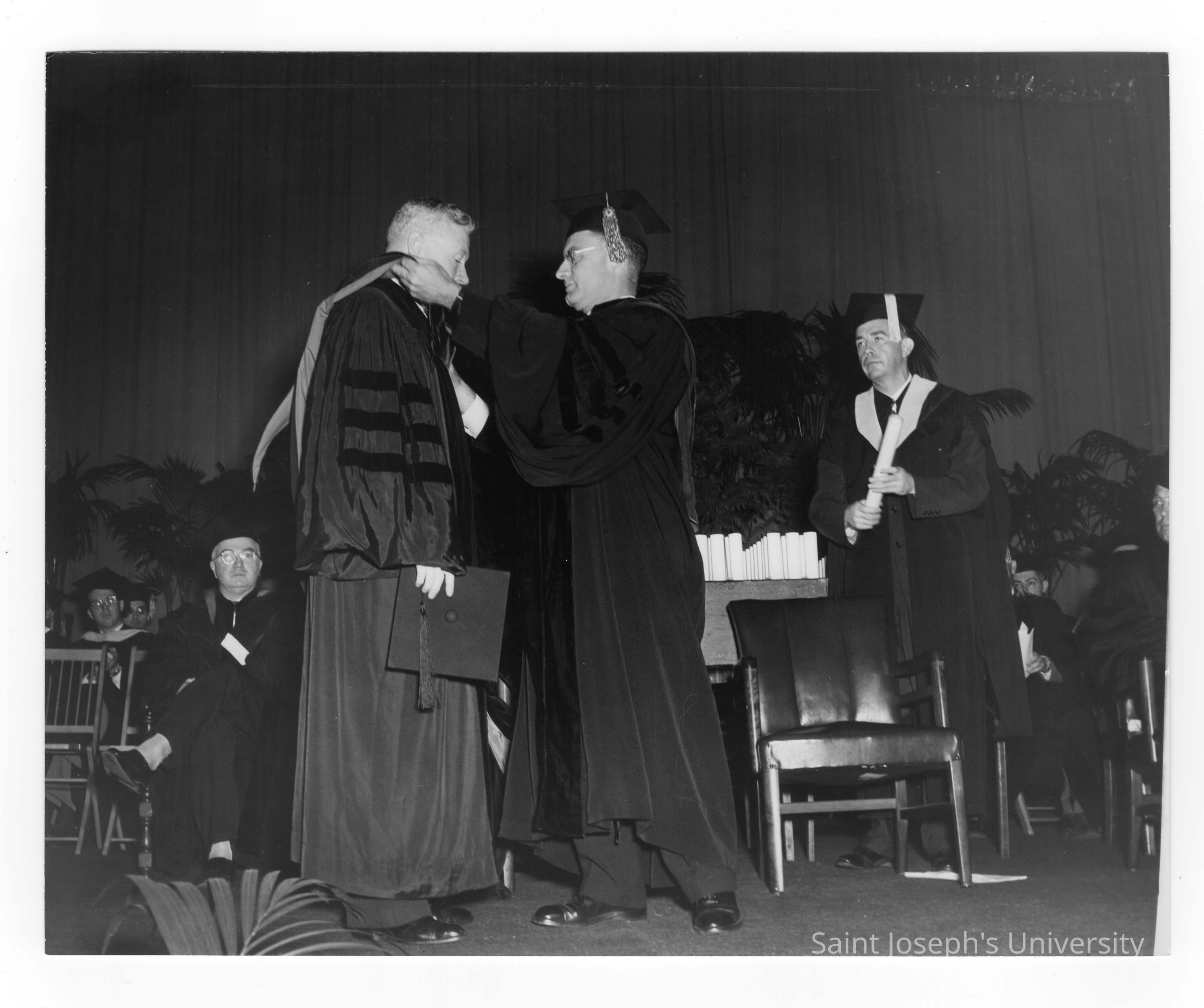 Edward G. Jacklin, S.J. bestowing honorary degree on Judge James C. Ganey with Michael Boland and others watching during 1952 graduation/commencement.